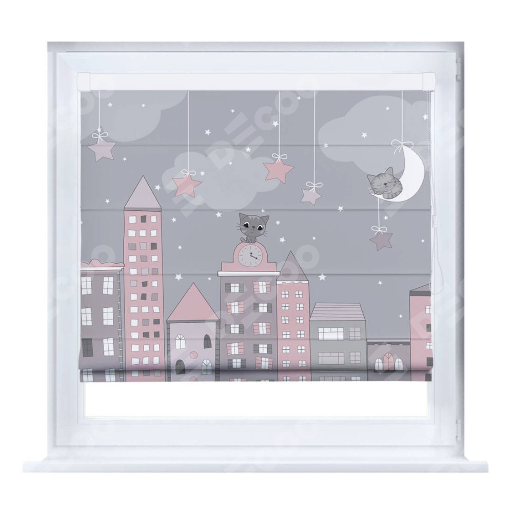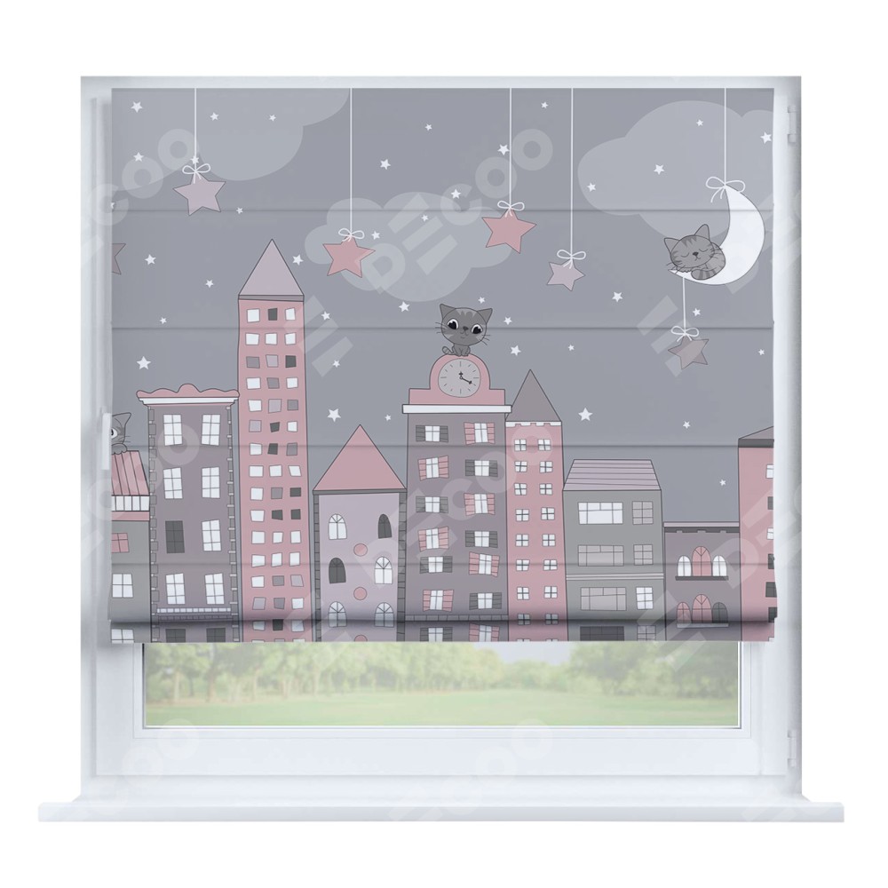 Римская штора производителя «Cortin», устанавливается на створку окна, пошита из ткани блэкаут с нанесением сублимационной печати «Вечерний город». Штора шьётся по индивидуальным размерам, для данного типа римской шторы возможная ширина от 35 до 150 см., высота до 250 см.