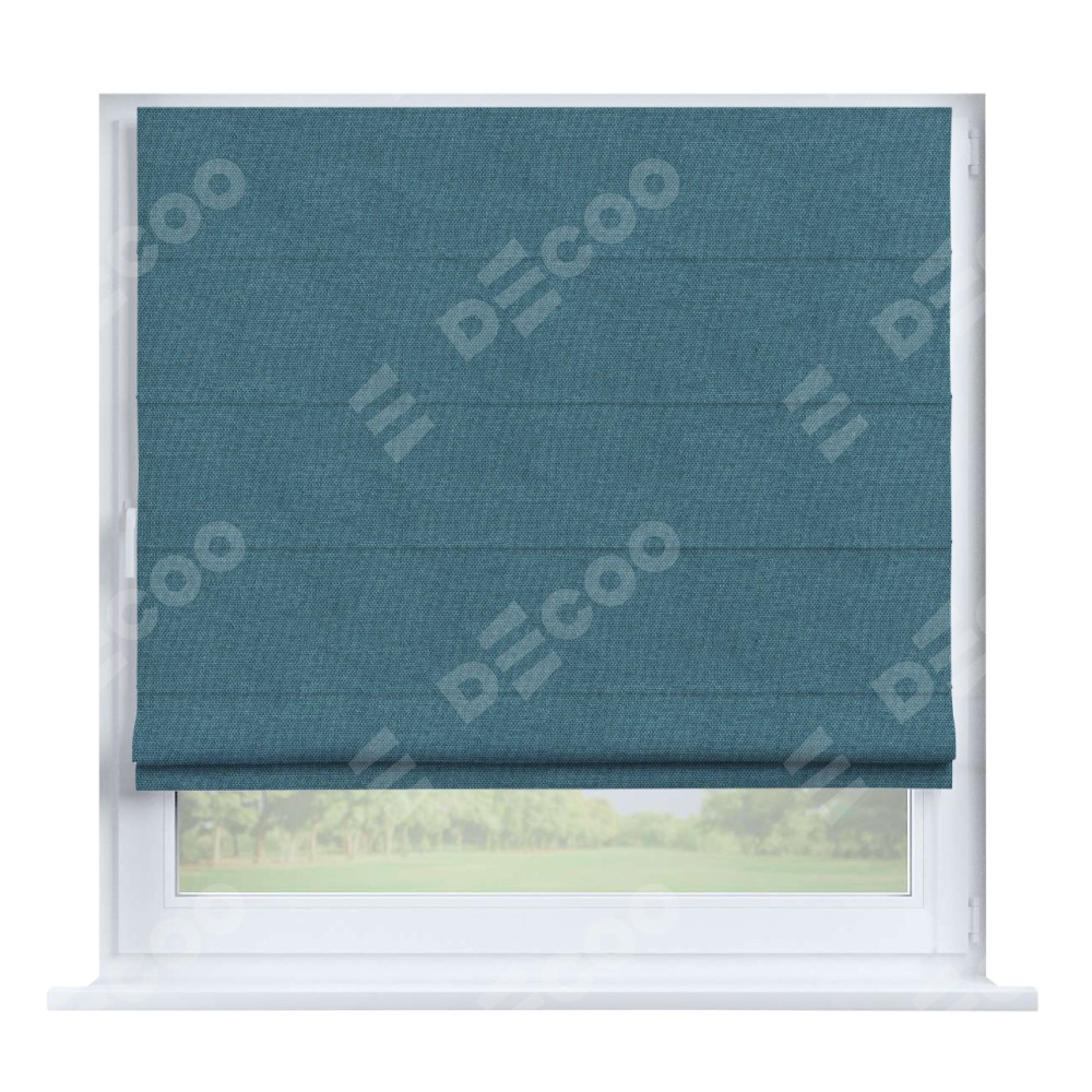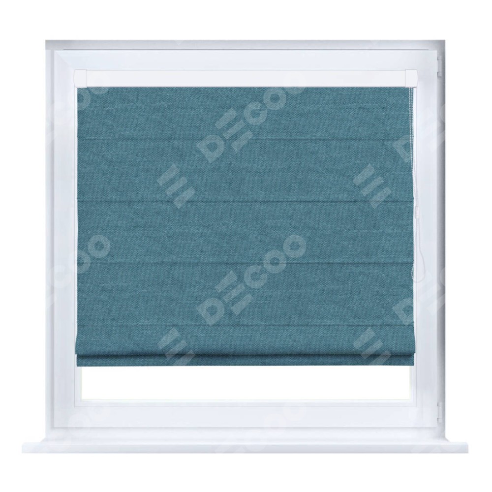Римская штора производителя «Cortin», устанавливается на створку окна, пошита из ткани лён димаут светло-синий, артикул 91007. Штора шьётся по индивидуальным размерам, для данного типа римской шторы возможная ширина от 35 до 150 см., высота до 250 см.