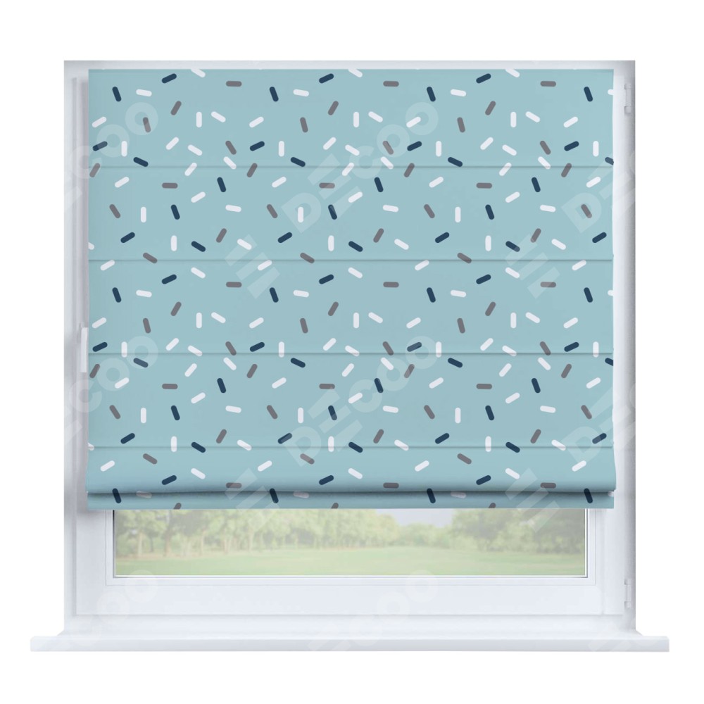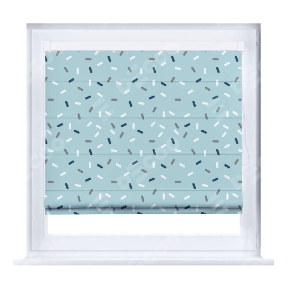 Римская штора производителя «Cortin», устанавливается на створку окна, пошита из ткани блэкаут с нанесением сублимационной печати «Короткие линии». Штора шьётся по индивидуальным размерам, для данного типа римской шторы возможная ширина от 35 до 150 см., высота до 250 см.