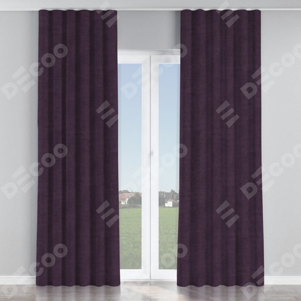 Комплект прямых штор, от производителя «Cortin», пошиты из ткани вельвет тёмно-фиолетовый, артикул ткани 72403. С изнаночной стороны в верхней части штор пристрачивается шторная лента с декоративными складками «Волна». Для создания элегантных складок прямые шторы шьются по стандарту с коэффициентом 1:2 (на 100 см. ширины проёма 200 см. ширины ткани).