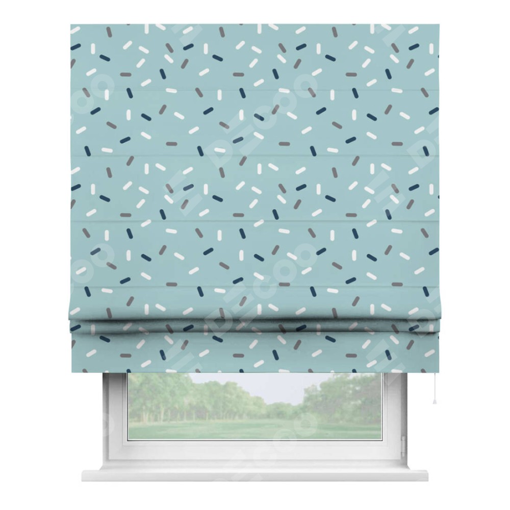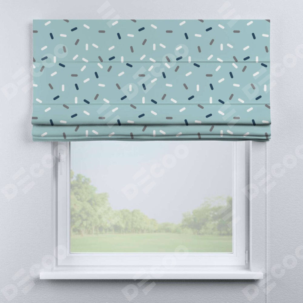 Римская штора производителя «Cortin», используется для проёма, пошита из ткани блэкаут с нанесением сублимационной печати «Короткие линии». Имеет универсальный механизм и подходит для монтажа: на потолок, на стену и в нишу.