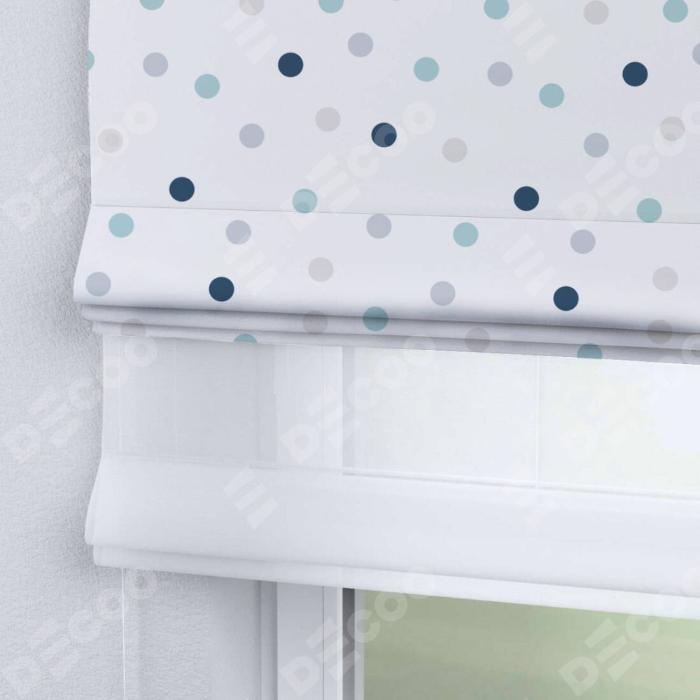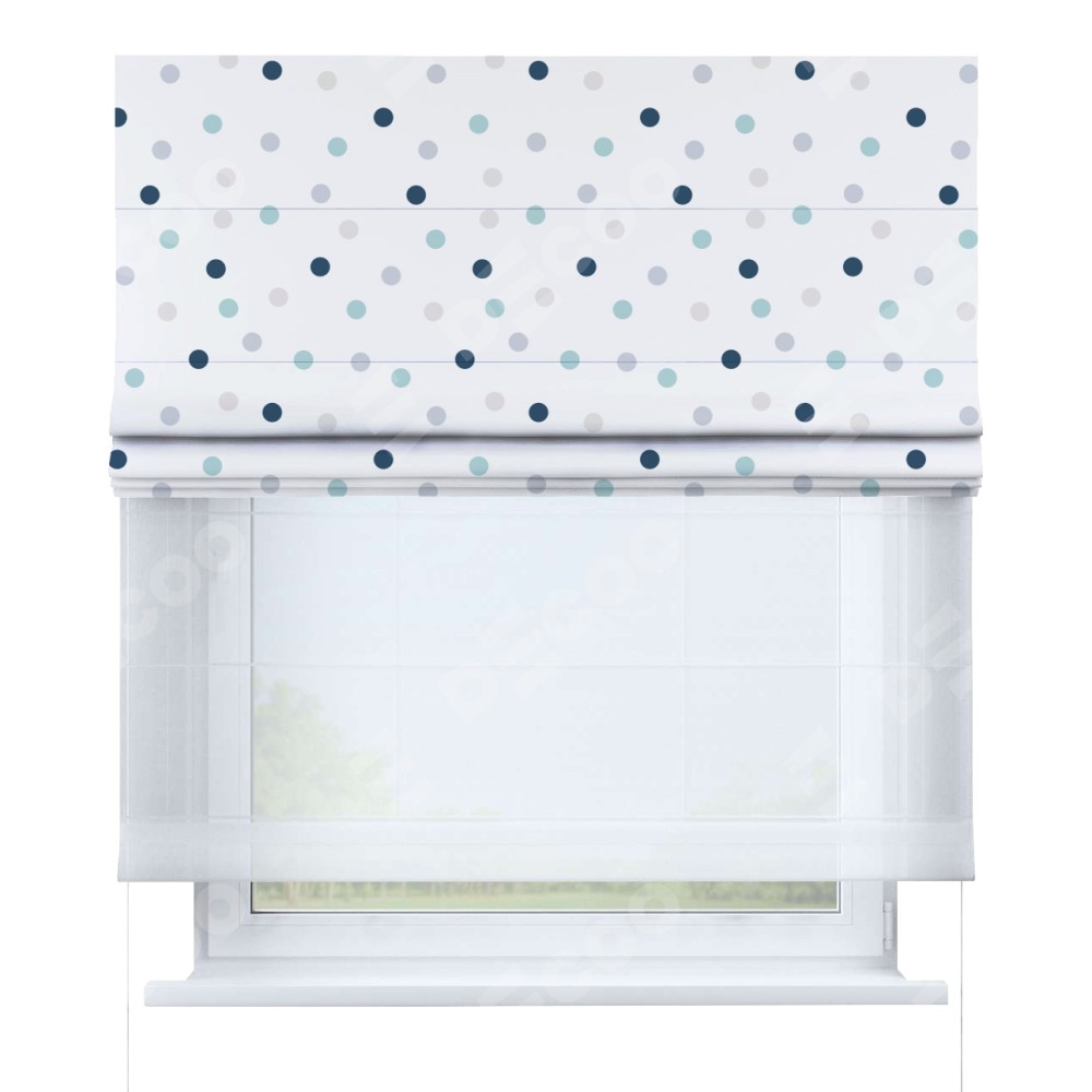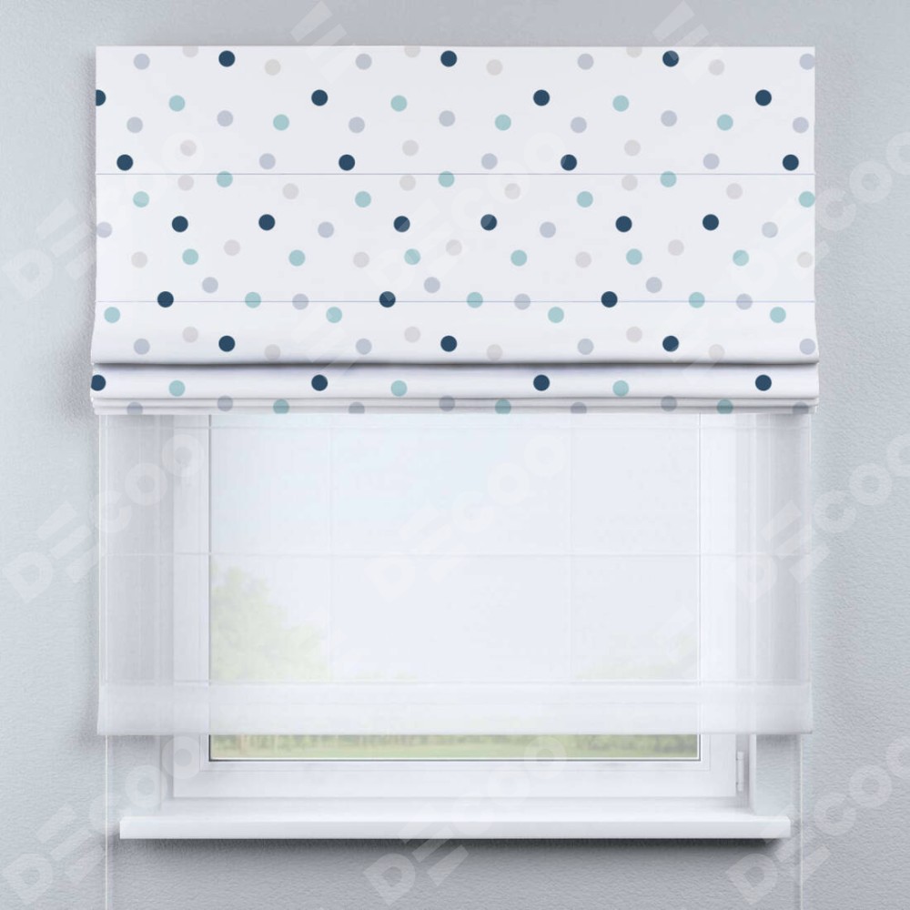 Римская штора день-ночь производителя «Cortin», используется для проёма, пошита из двух полотен, с лицевой блэкаут с нанесением сублимационной печати «Точки», вторая ткань тюль (по стандарту комплектуется тюль белого цвета артикул V-01). Имеет универсальный механизм и подходит для монтажа: на потолок, на стену и в нишу.