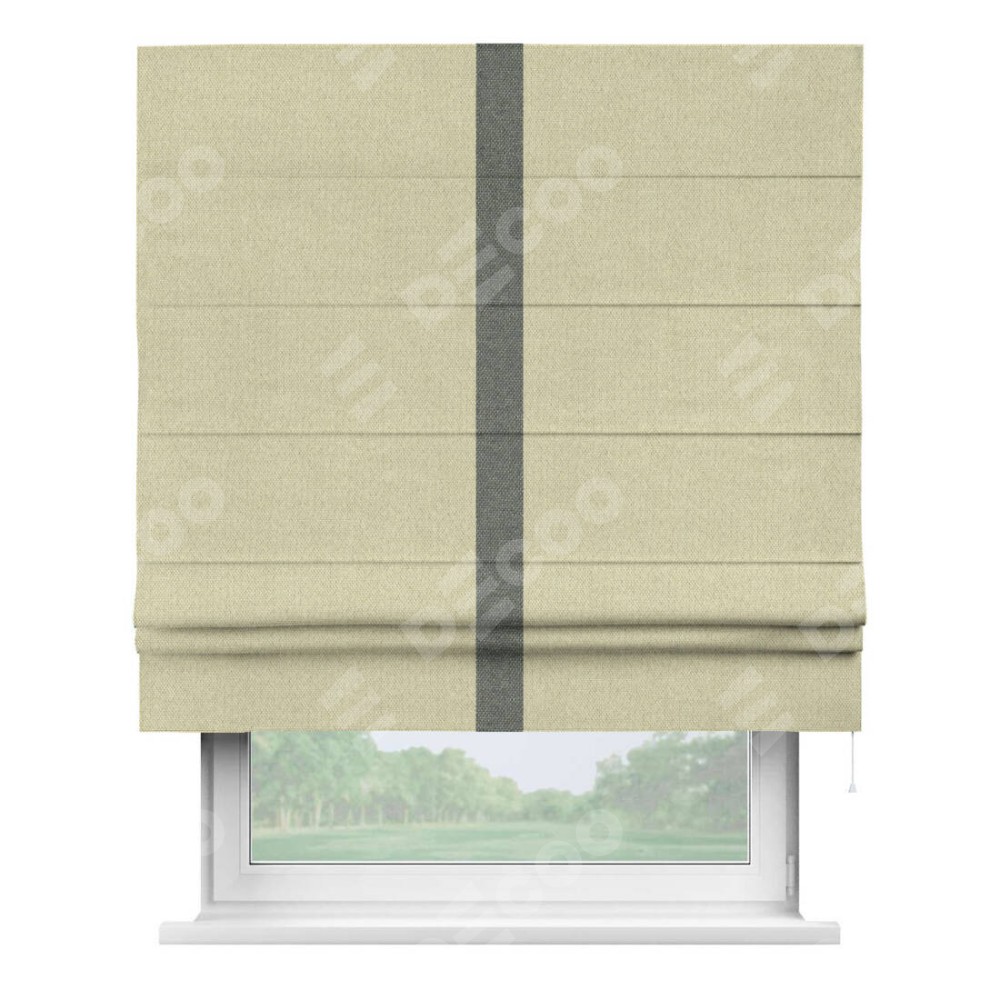 Римская штора производителя «Cortin», используется для проёма, пошита из ткани лён димаут шампань, артикул 90994. Отделка шторы кантом «Хайвэй», ткань для канта используется из льна димаут разной расцветки на выбор. Имеет универсальный механизм и подходит для монтажа: на потолок, на стену и в нишу.