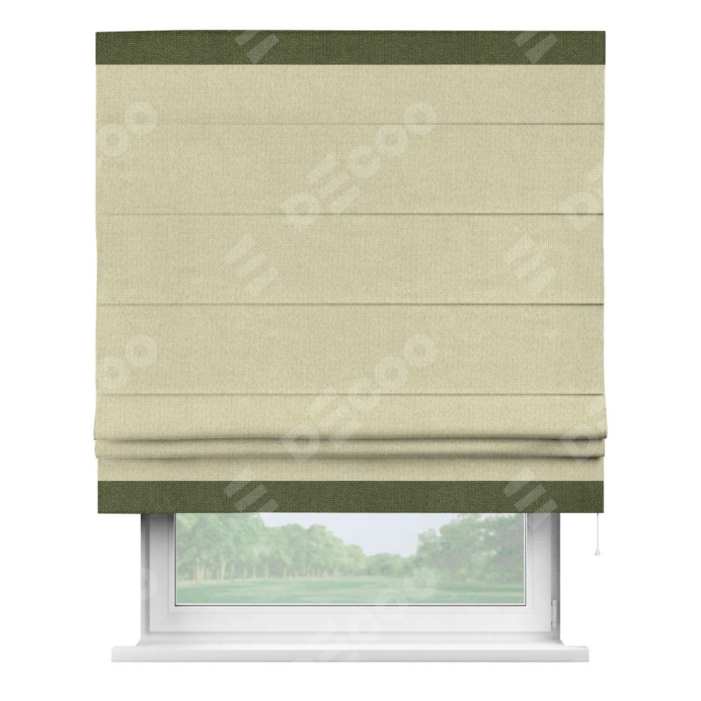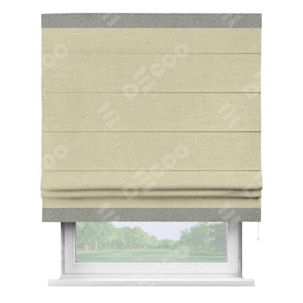 Римская штора производителя «Cortin», используется для проёма, пошита из ткани лён димаут шампань, артикул 90994. Отделка шторы кантом «Горизонт», ткань для канта используется из льна димаут разной расцветки на выбор. Имеет универсальный механизм и подходит для монтажа: на потолок, на стену и в нишу.