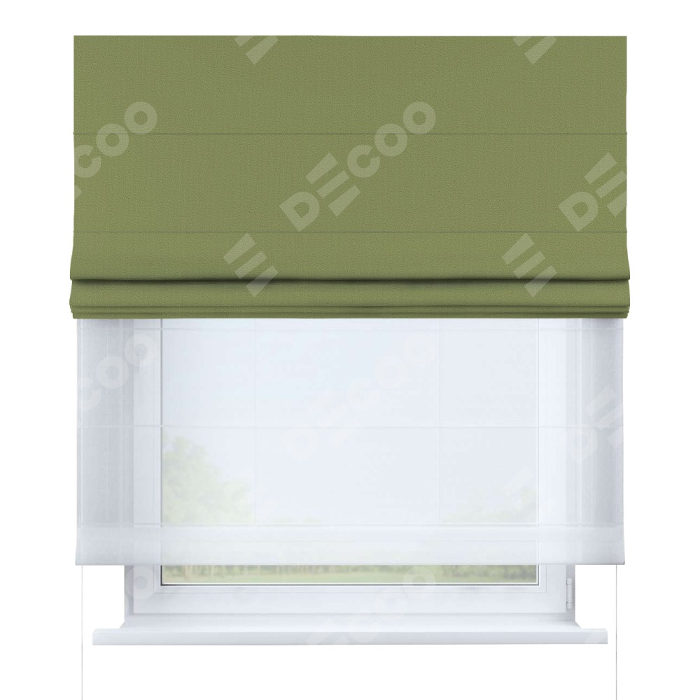 Двойная римская штора «День-ночь» от производителя Cortin предназначена для использования в проёмах. Эта штора уникальна тем, что состоит из двух полотен. На лицевой стороне находится бархат золотая оливка (артикул: 90725), обеспечивающий эффективное затемнение. В комплект также входит вторая ткань — легкий белый тюль (артикул: V-01), который добавляет изящества и легкости оформлению окна. Кроме того, доступны и другие разновидности ткани тюль, выбор которых доступен по  ссылке .