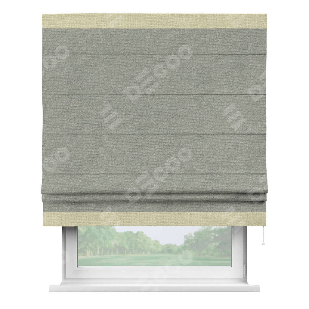 Римская штора производителя «Cortin», используется для проёма, пошита из ткани лён димаут серый, артикул 91009. Отделка шторы кантом «Горизонт», ткань для канта используется из льна димаут разной расцветки на выбор. Имеет универсальный механизм и подходит для монтажа: на потолок, на стену и в нишу.