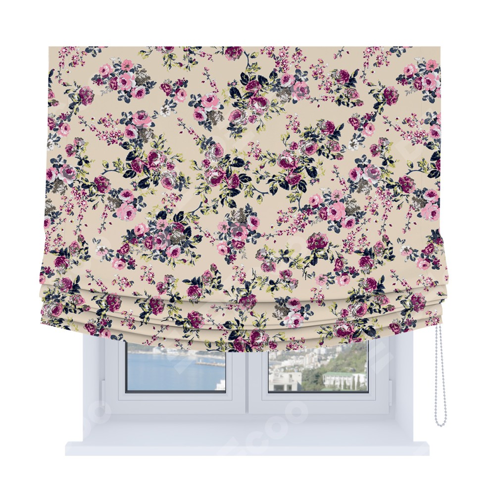 Римская штора Soft производителя «Cortin», используется для проёма, пошита из ткани блэкаут с нанесением сублимационной печати «Россыпь розовых цветов». Имеет универсальный механизм и подходит для монтажа: на потолок, на стену и в нишу. В отличие от стандартных римских штор, римская штора Soft не имеет горизонтальных вставок и нижнего отвеса. Это позволяет ткани произвольно драпироваться в свободные мягкие складки.