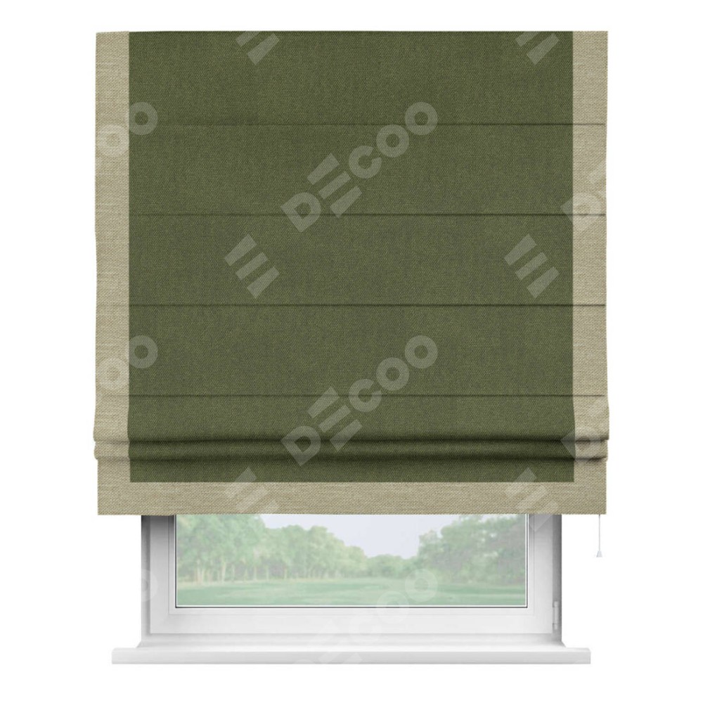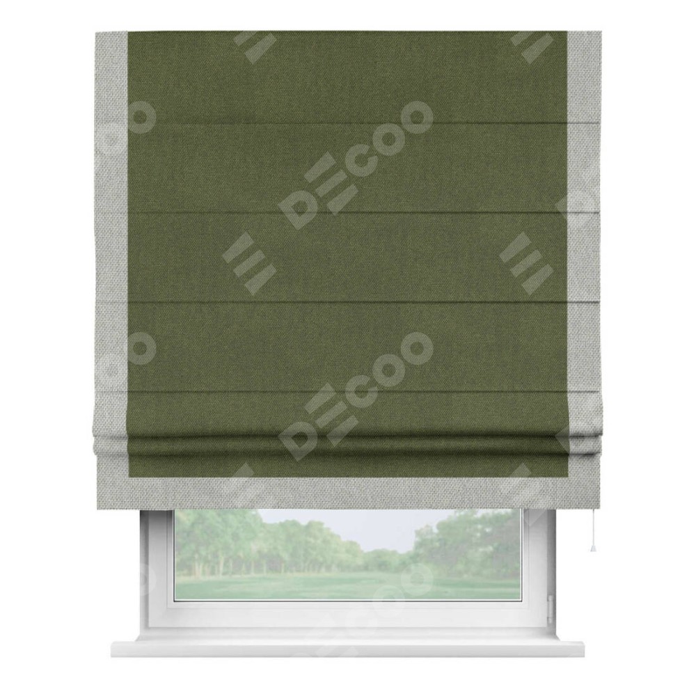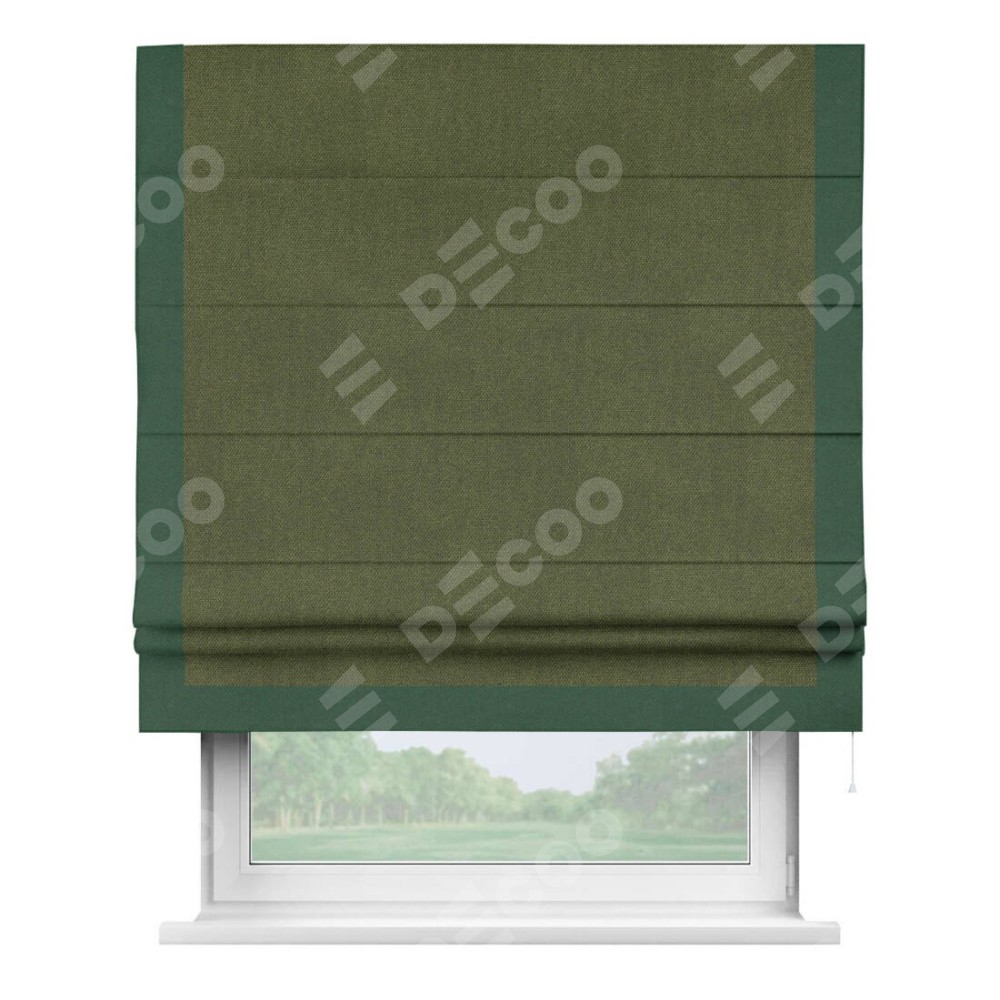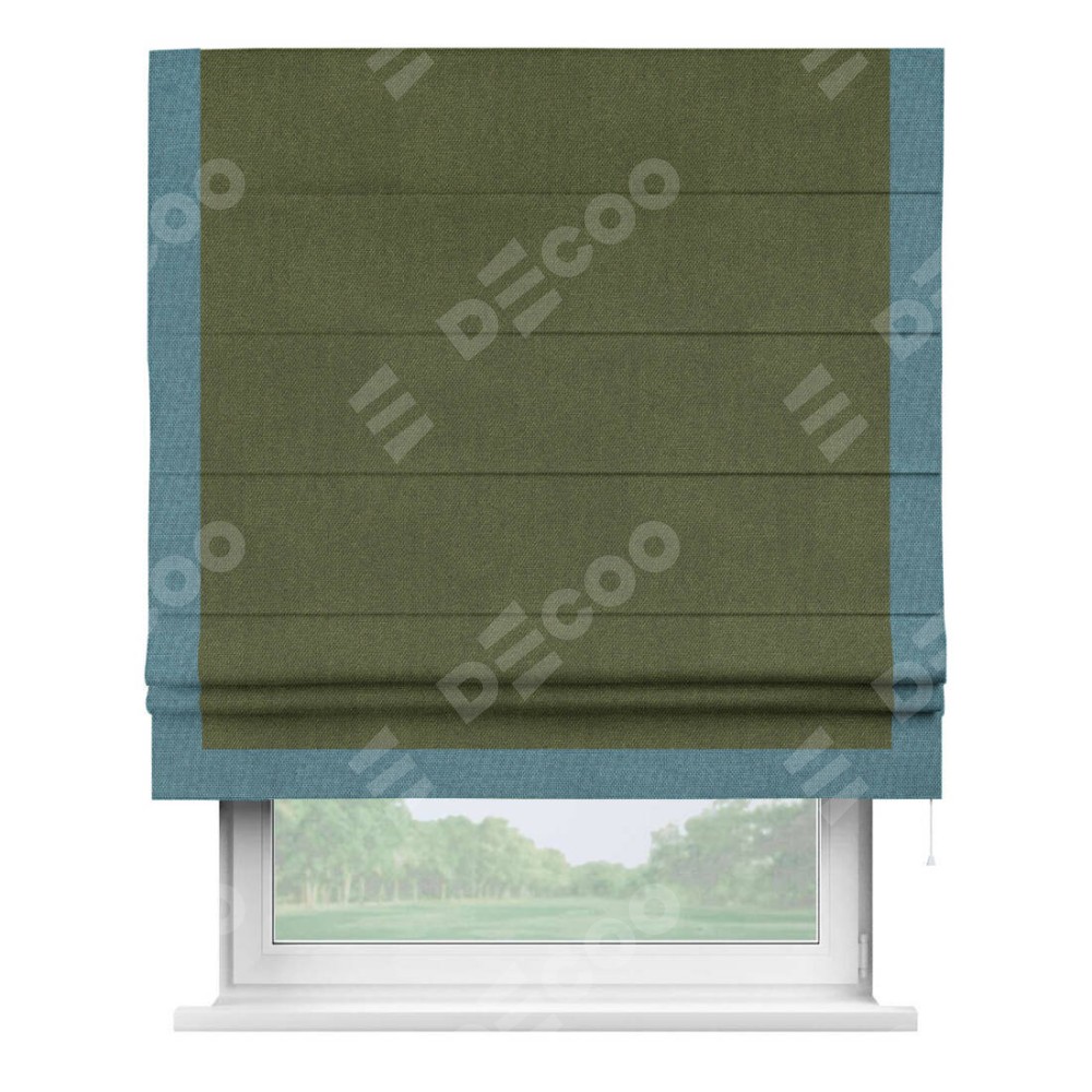 Римская штора производителя «Cortin», используется для проёма, пошита из ткани лён димаут салатовый, артикул 91002. Отделка шторы кантом «Виктория», ткань для канта используется из льна димаут разной расцветки на выбор. Имеет универсальный механизм и подходит для монтажа: на потолок, на стену и в нишу.