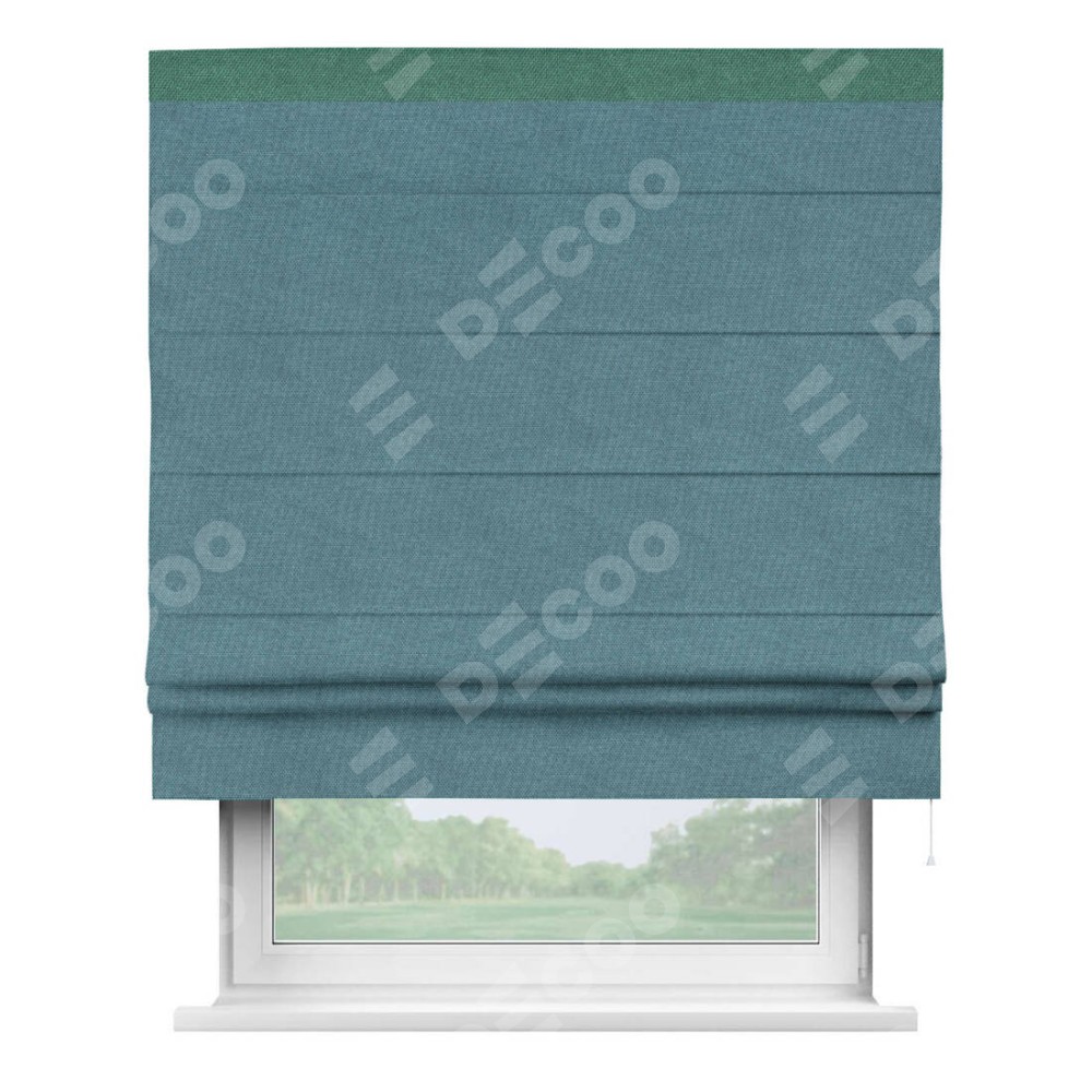 Римская штора производителя «Cortin», используется для проёма, пошита из ткани лён димаут светло-синий, артикул 91007. Отделка шторы кантом «Кинг», ткань для канта используется из льна димаут разной расцветки на выбор. Имеет универсальный механизм и подходит для монтажа: на потолок, на стену и в нишу.