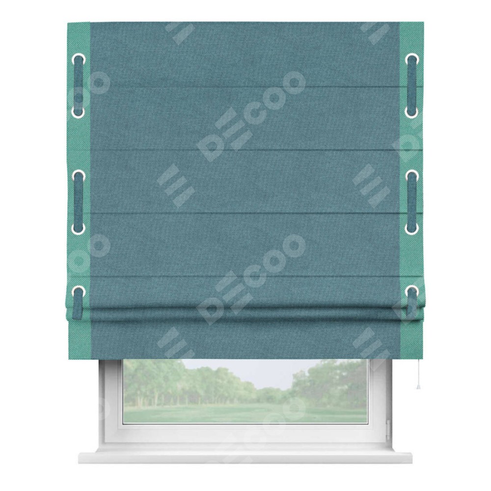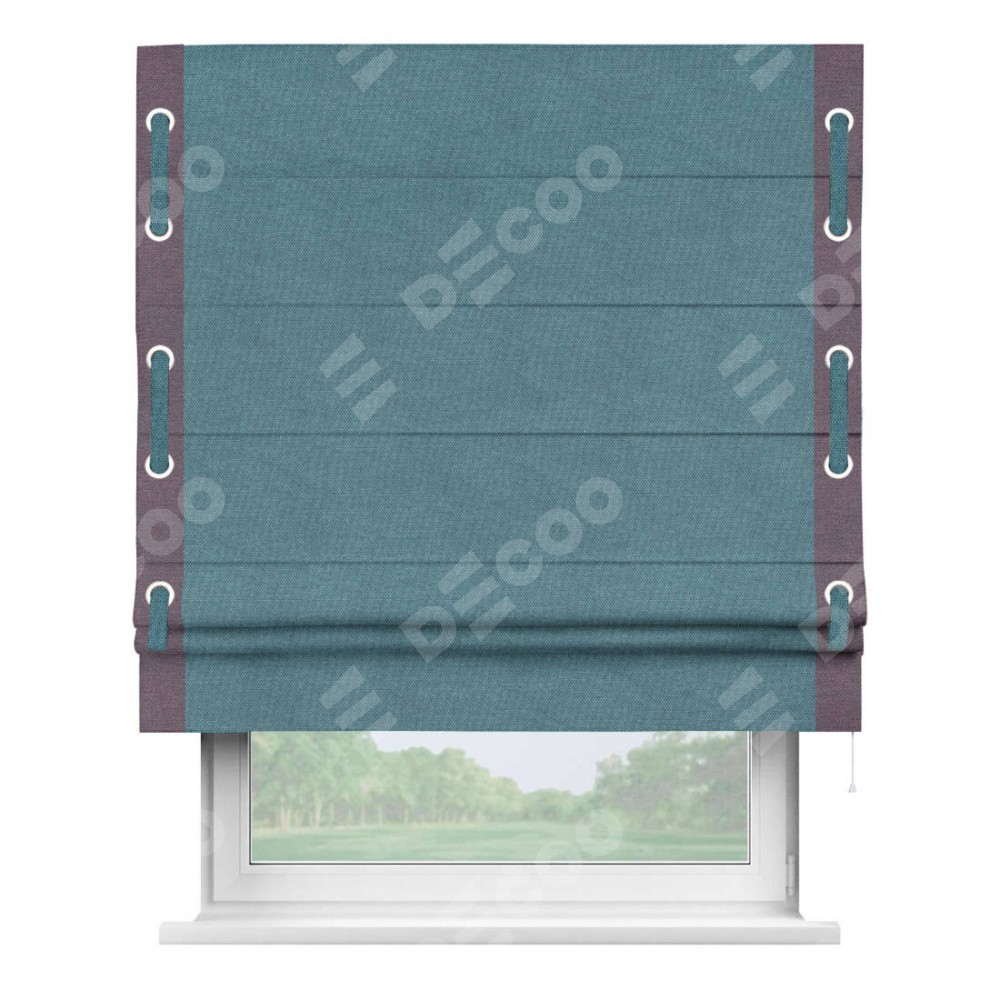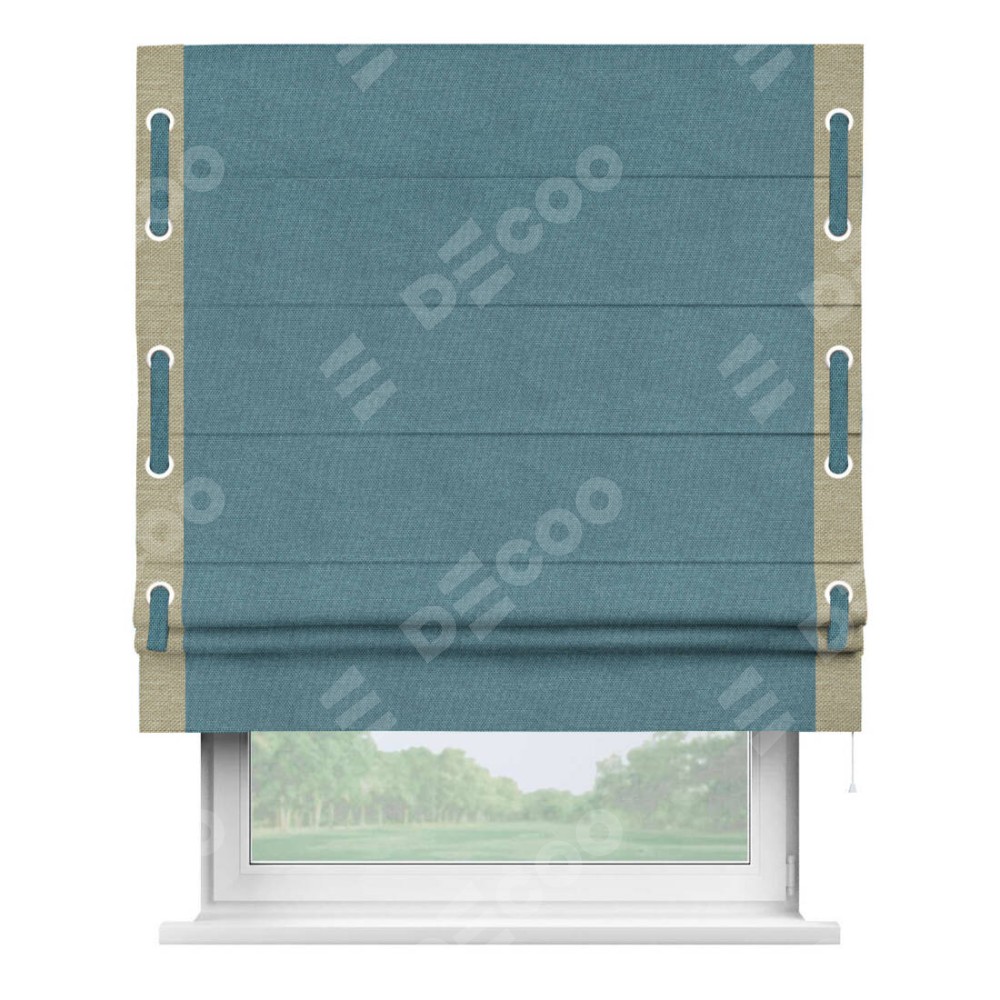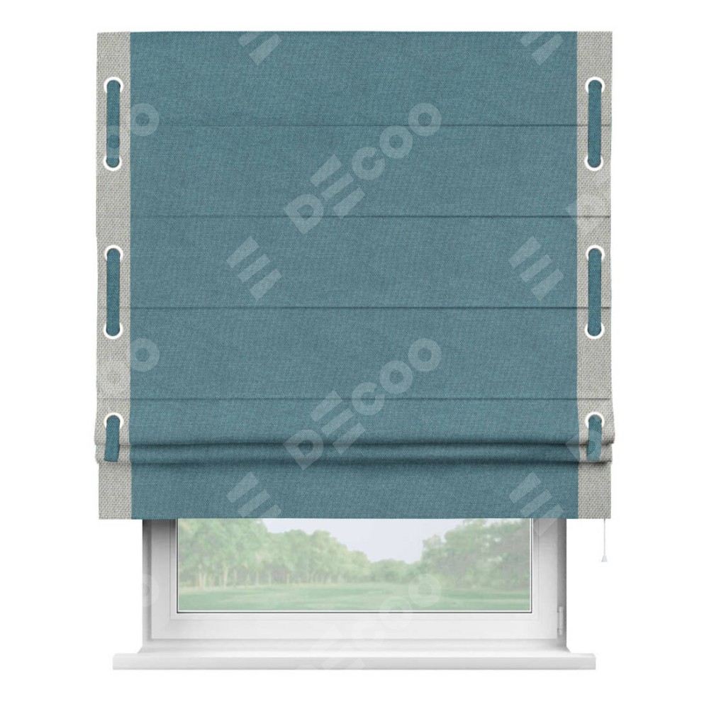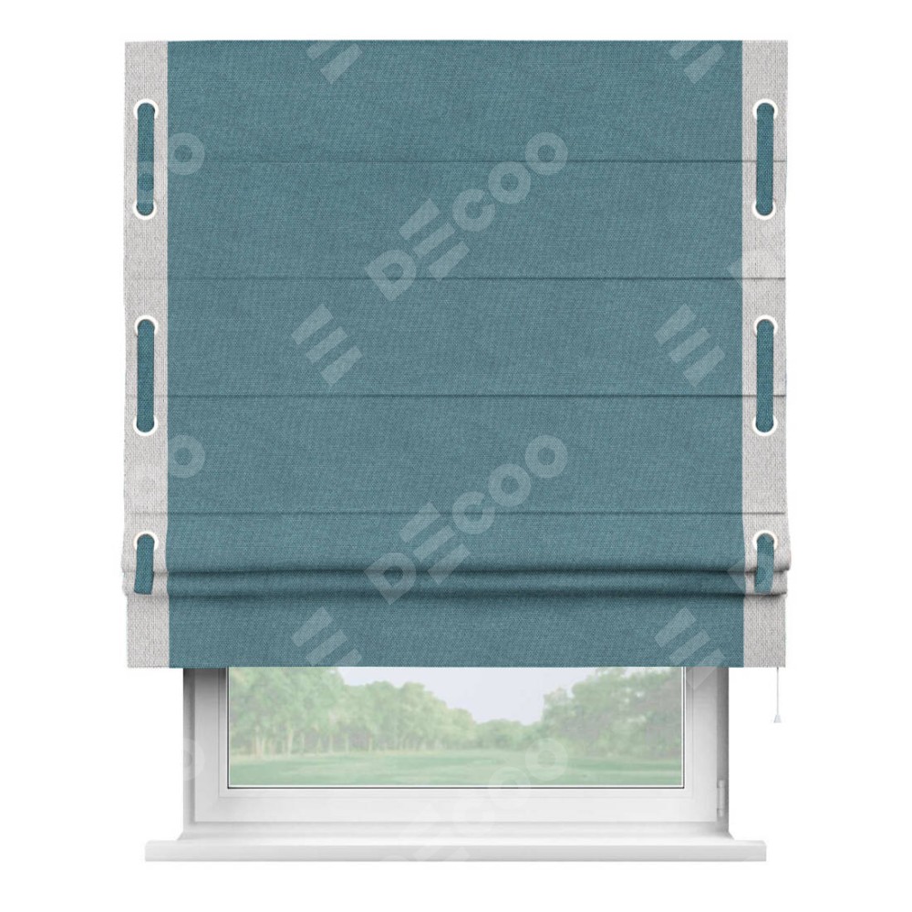 Римская штора «Кортин» для проема, лён димаут светло-синий с кантом Стрим Дуо (люверсы с пояском)