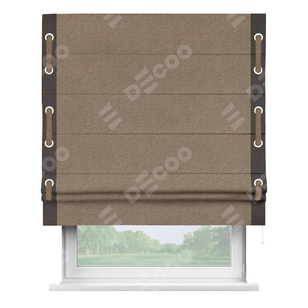 Римская штора «Кортин» для проема, лён димаут коричневый с кантом Стрим Дуо (люверсы с пояском)