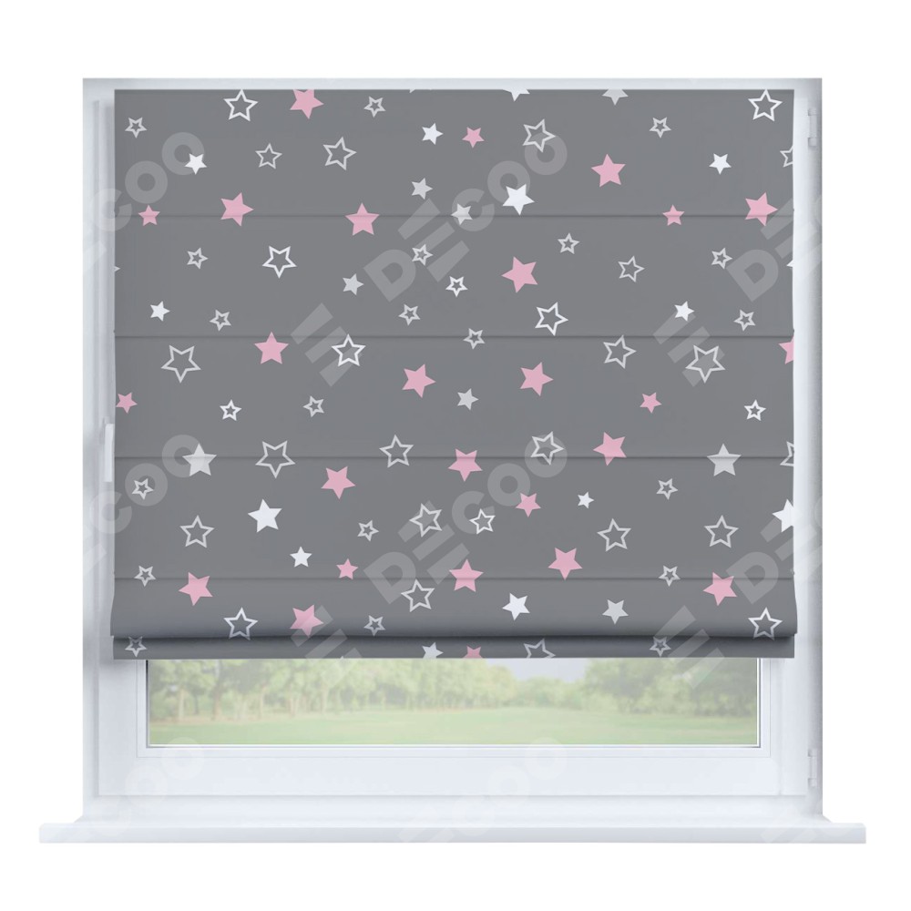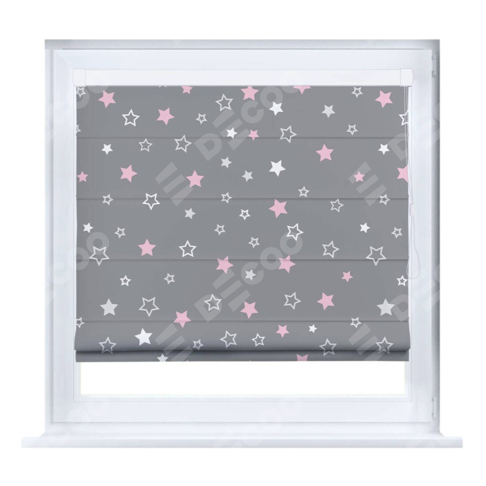 Римская штора производителя «Cortin», устанавливается на створку окна, пошита из ткани блэкаут с нанесением сублимационной печати «Розовый звездопад». Штора шьётся по индивидуальным размерам, для данного типа римской шторы возможная ширина от 35 до 150 см., высота до 250 см.