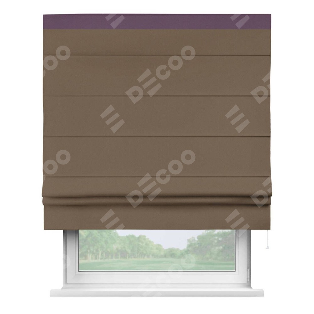 Римская штора производителя «Cortin», используется для проёма, пошита из ткани блэкаут однотонный коричневый, артикул ткани 91334. Отделка шторы кантом «Кинг», ткань для канта используется из блэкаута однотонного разной расцветки на выбор. Имеет универсальный механизм и подходит для монтажа: на потолок, на стену и в нишу.