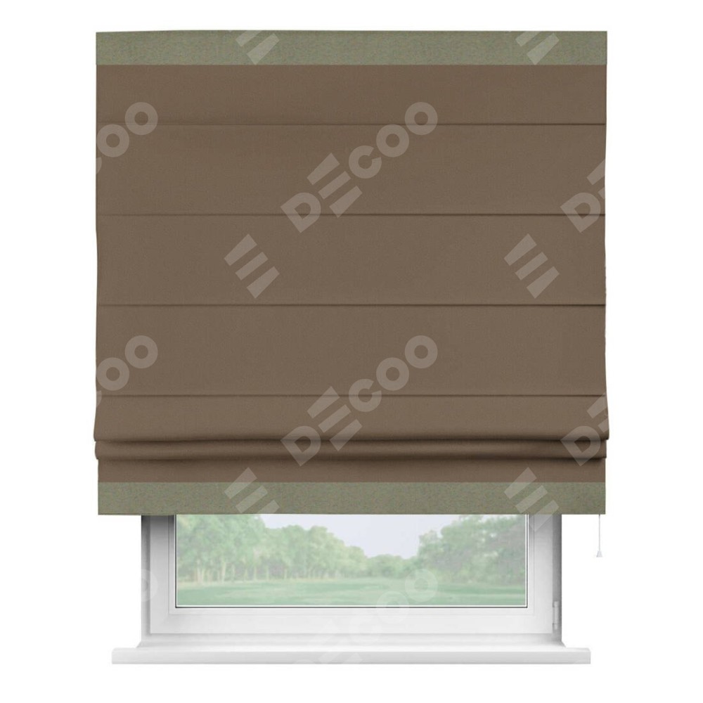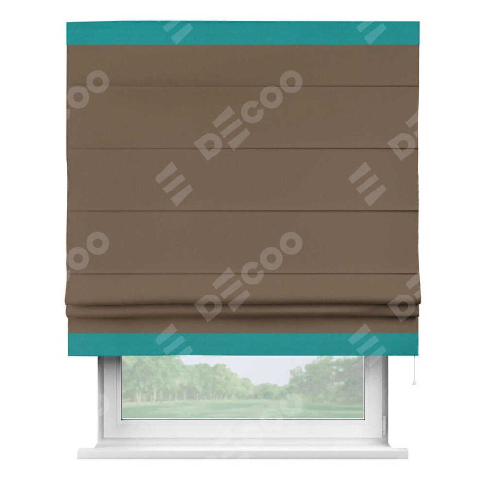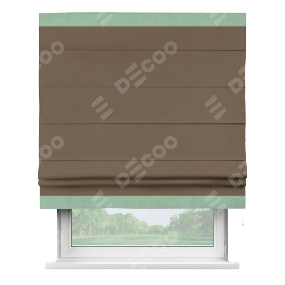 Римская штора производителя «Cortin», используется для проёма, пошита из ткани блэкаут однотонный коричневый, артикул ткани 91334. Отделка шторы кантом «Горизонт», ткань для канта используется из блэкаута однотонного разной расцветки на выбор. Имеет универсальный механизм и подходит для монтажа: на потолок, на стену и в нишу.