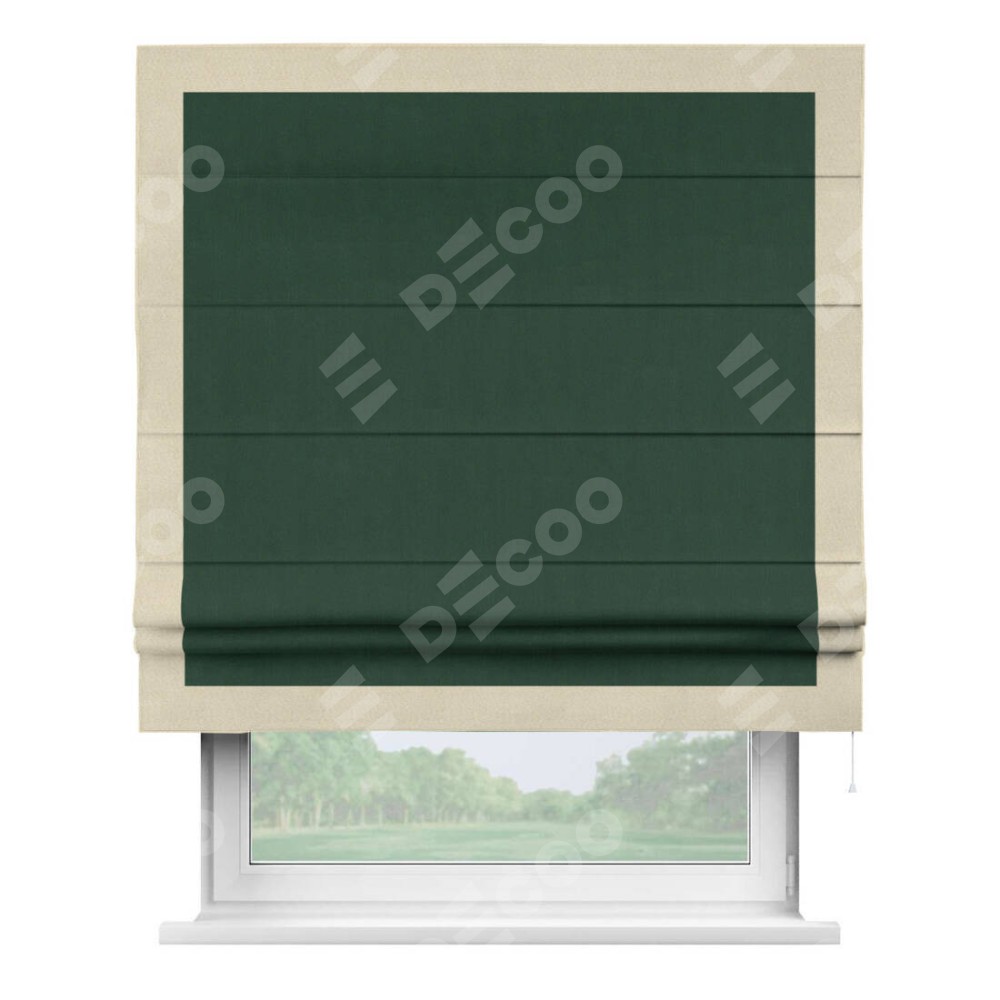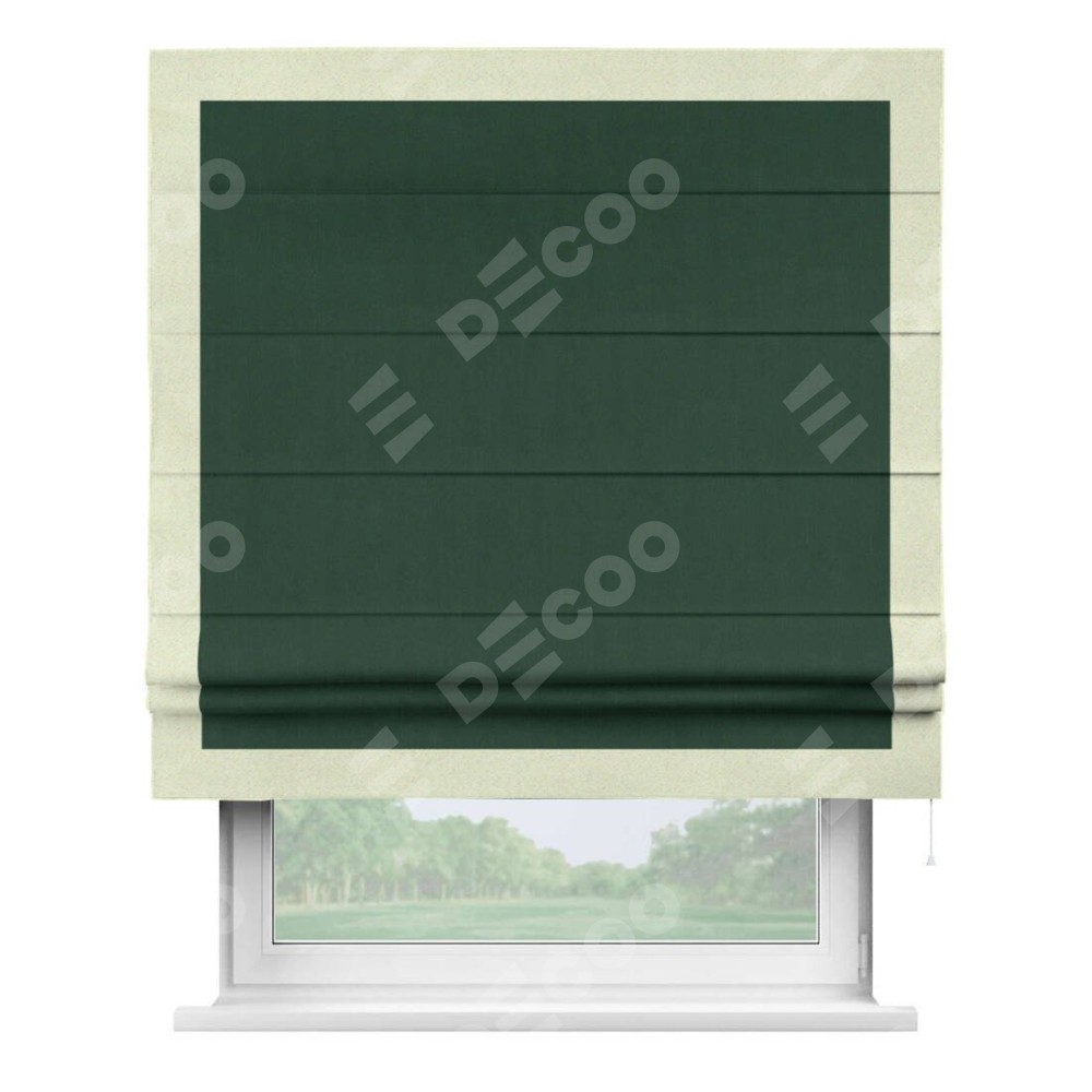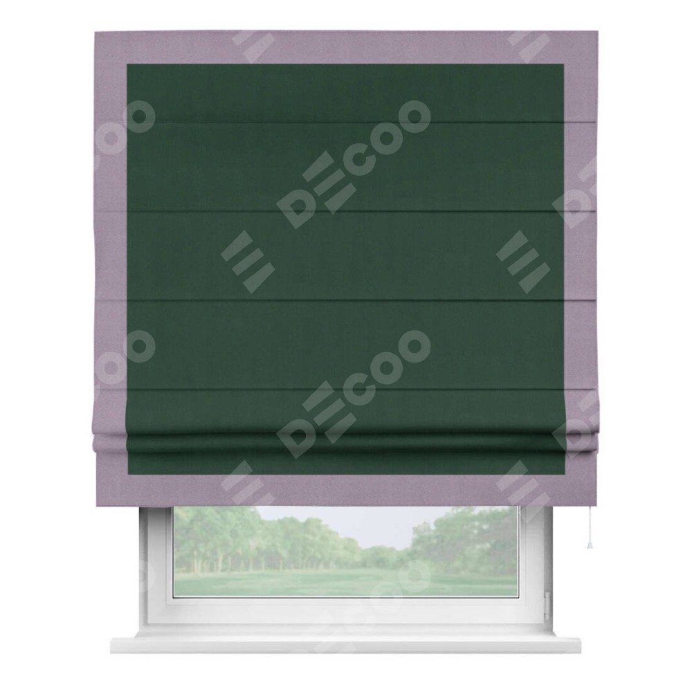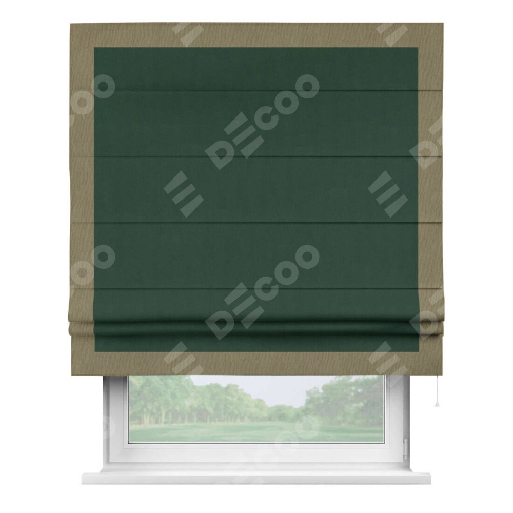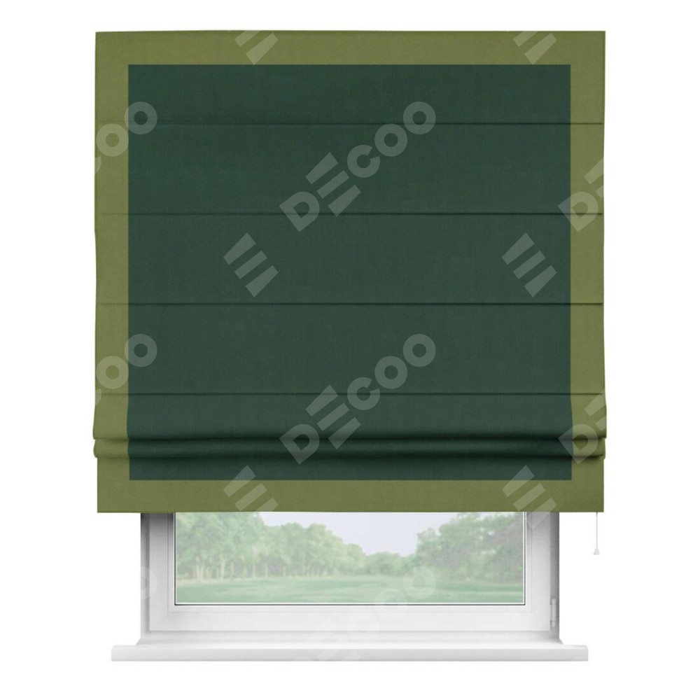 Римская штора производителя «Cortin», используется для проёма, пошита из ткани блэкаут однотонный зелёный, артикул ткани 91572−2. Отделка шторы кантом «Чесс», ткань для канта используется из блэкаута однотонного разной расцветки на выбор. Имеет универсальный механизм и подходит для монтажа: на потолок, на стену и в нишу.