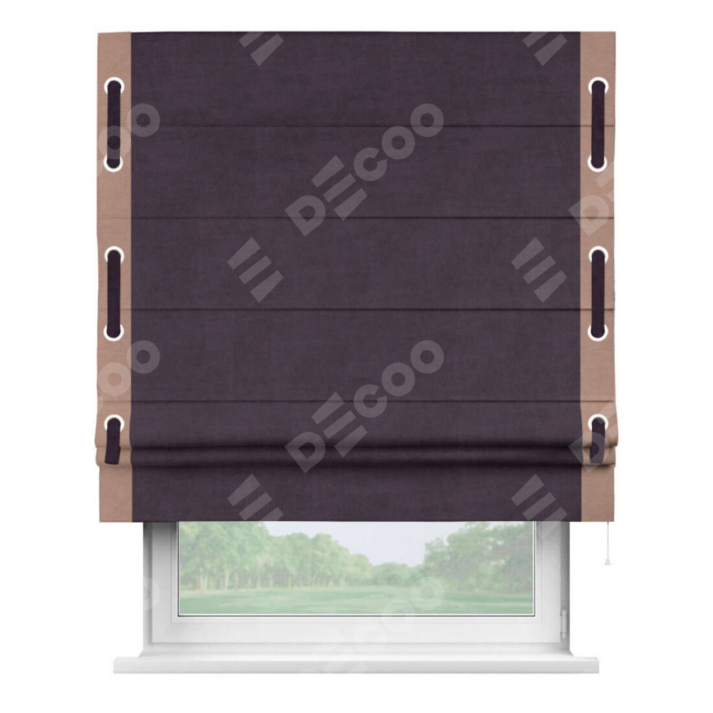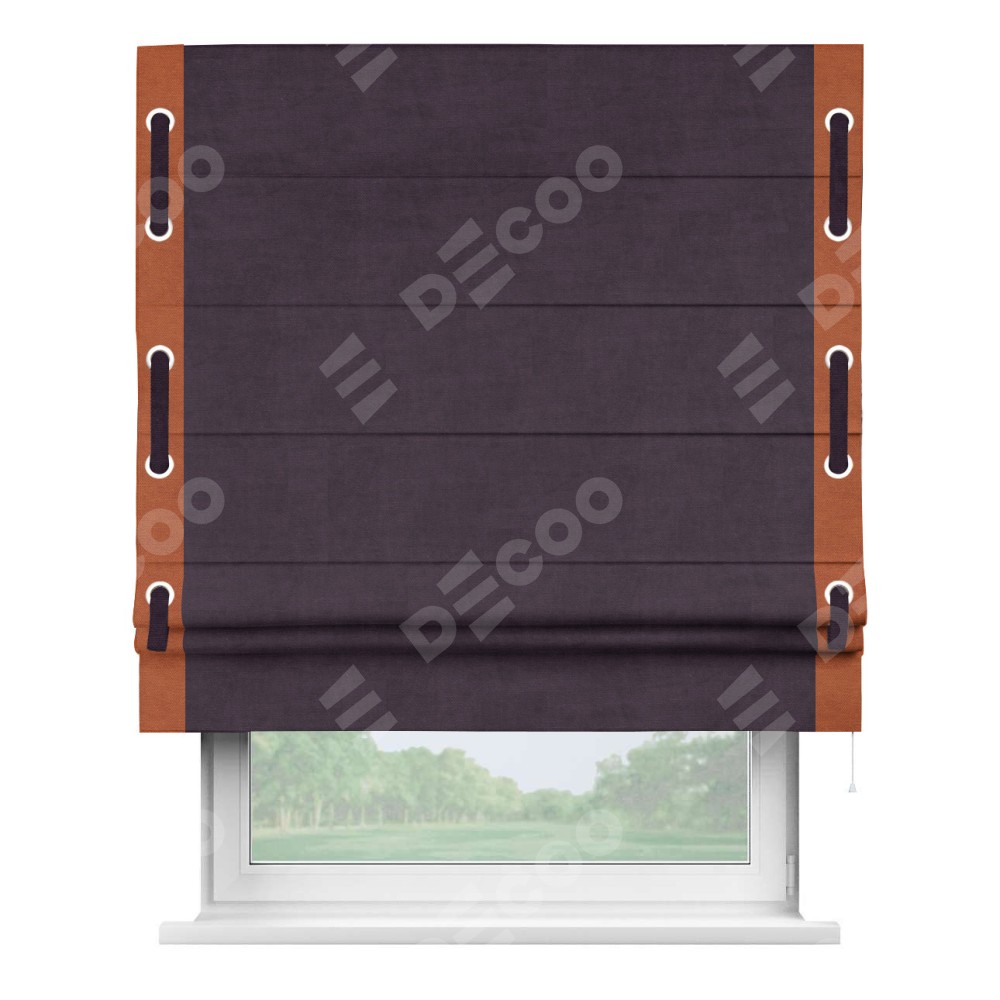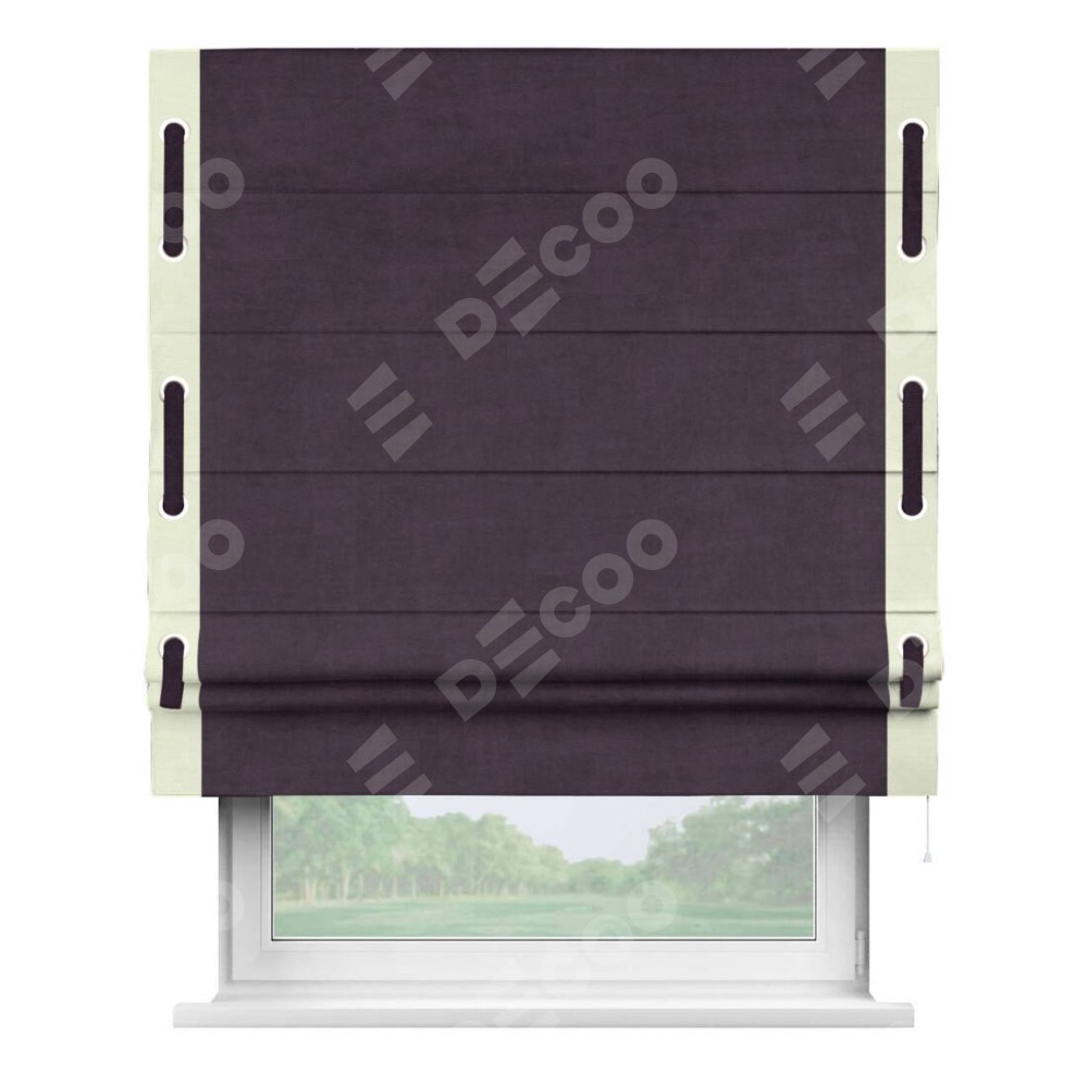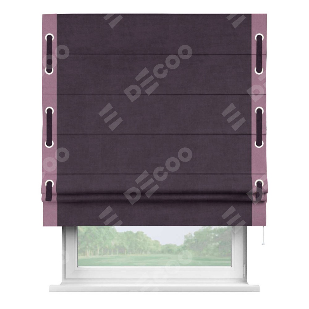 Римская штора «Кортин» для проема, вельвет тёмно-фиолетовый с кантом Стрим Дуо (люверсы с пояском)