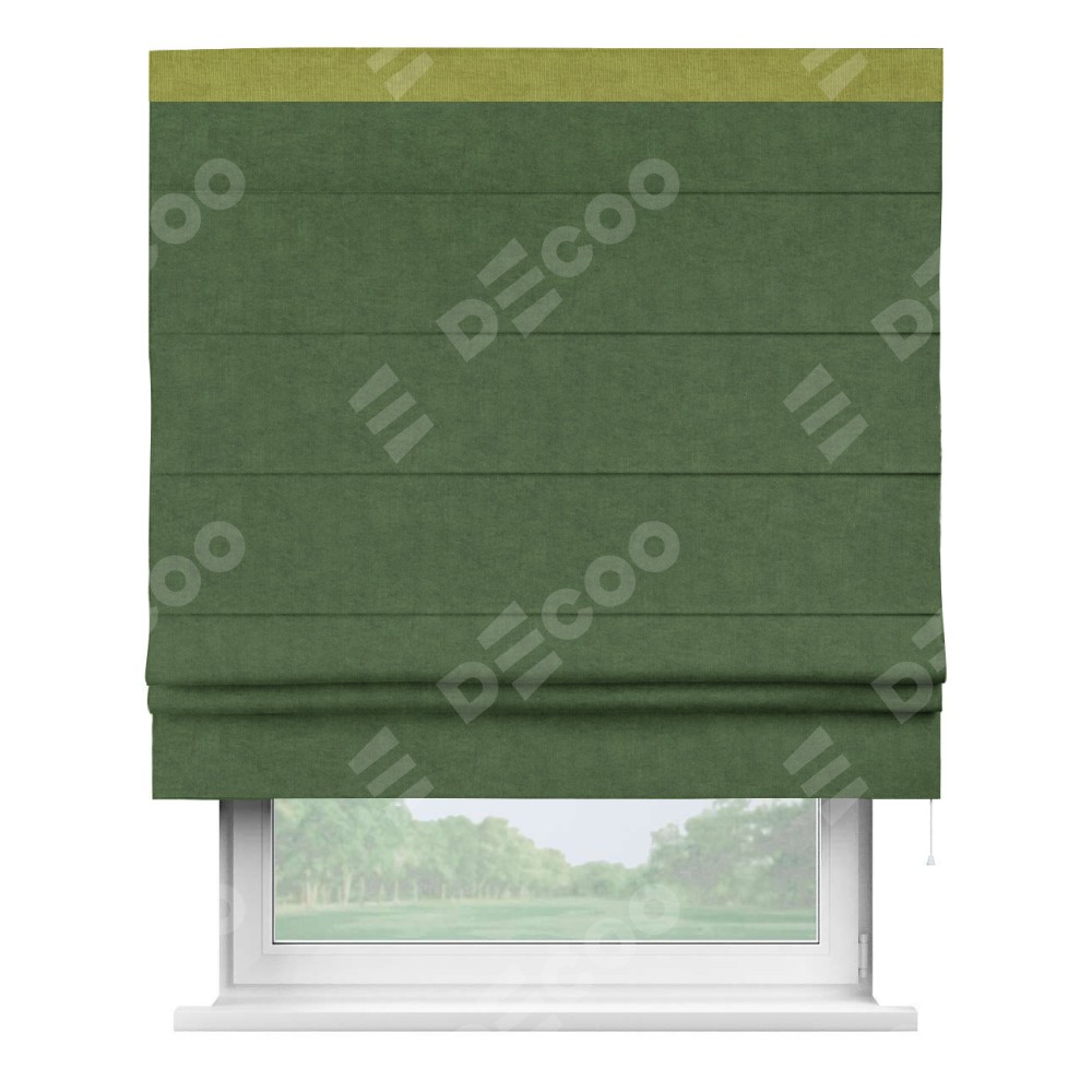Римская штора производителя «Cortin», используется для проёма, пошита из ткани канвас зелёный, артикул ткани v-16. Отделка шторы кантом «Кинг» (зелёное яблоко v-370), ткань для канта используется из канваса разной расцветки на выбор. Имеет универсальный механизм и подходит для монтажа: на потолок, на стену и в нишу.
