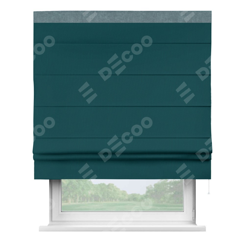 Римская штора производителя «Cortin», используется для проёма, пошита из ткани канвас изумрудный, артикул ткани v-12487. Отделка шторы кантом «Кинг» (серо-голубой v-330), ткань для канта используется из канваса разной расцветки на выбор. Имеет универсальный механизм и подходит для монтажа: на потолок, на стену и в нишу.