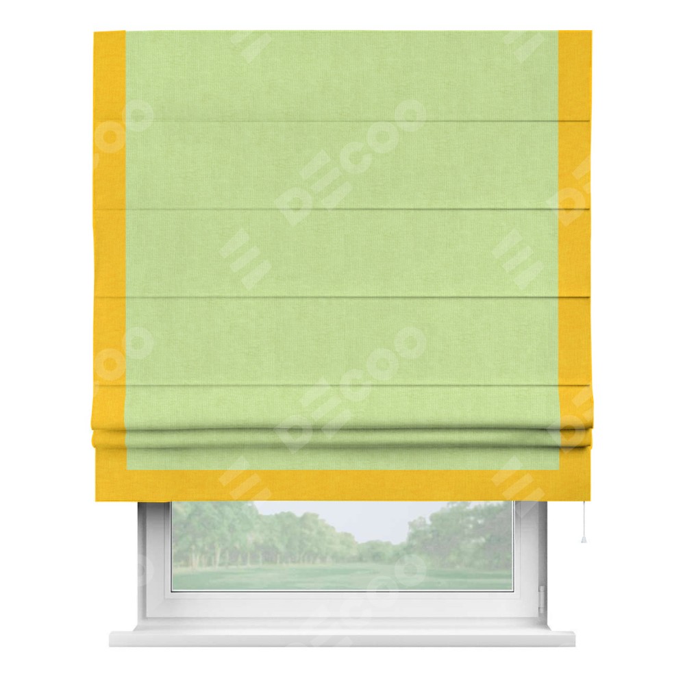 Римская штора производителя «Cortin», используется для проёма, пошита из ткани канвас липовый, артикул ткани v-207. Отделка шторы кантом «Виктория» (желтый v-344), ткань для канта используется из канваса разной расцветки на выбор. Имеет универсальный механизм и подходит для монтажа: на потолок, на стену и в нишу.