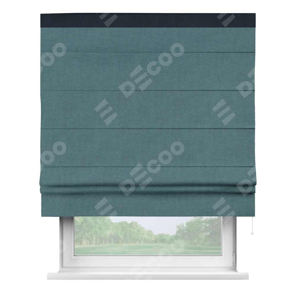 Римская штора производителя «Cortin», используется для проёма, пошита из ткани канвас ментоловый, артикул ткани v-114. Отделка шторы кантом «Кинг» (тёмно-синий v-206), ткань для канта используется из канваса разной расцветки на выбор. Имеет универсальный механизм и подходит для монтажа: на потолок, на стену и в нишу.