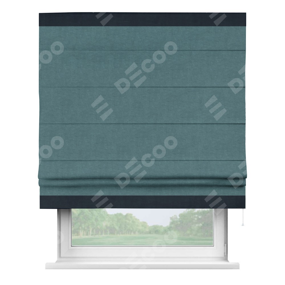 Римская штора производителя «Cortin», используется для проёма, пошита из ткани канвас ментоловый, артикул ткани v-114. Отделка шторы кантом «Горизонт» (тёмно-синий v-206), ткань для канта используется из канваса разной расцветки на выбор. Имеет универсальный механизм и подходит для монтажа: на потолок, на стену и в нишу.