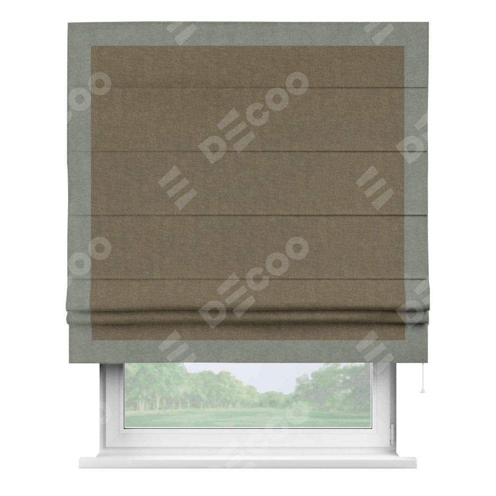 Римская штора производителя «Cortin», используется для проёма, пошита из ткани канвас молочный шоколад, артикул ткани v-08. Отделка шторы кантом «Чесс» (сизый v-1902), ткань для канта используется из канваса разной расцветки на выбор. Имеет универсальный механизм и подходит для монтажа: на потолок, на стену и в нишу.