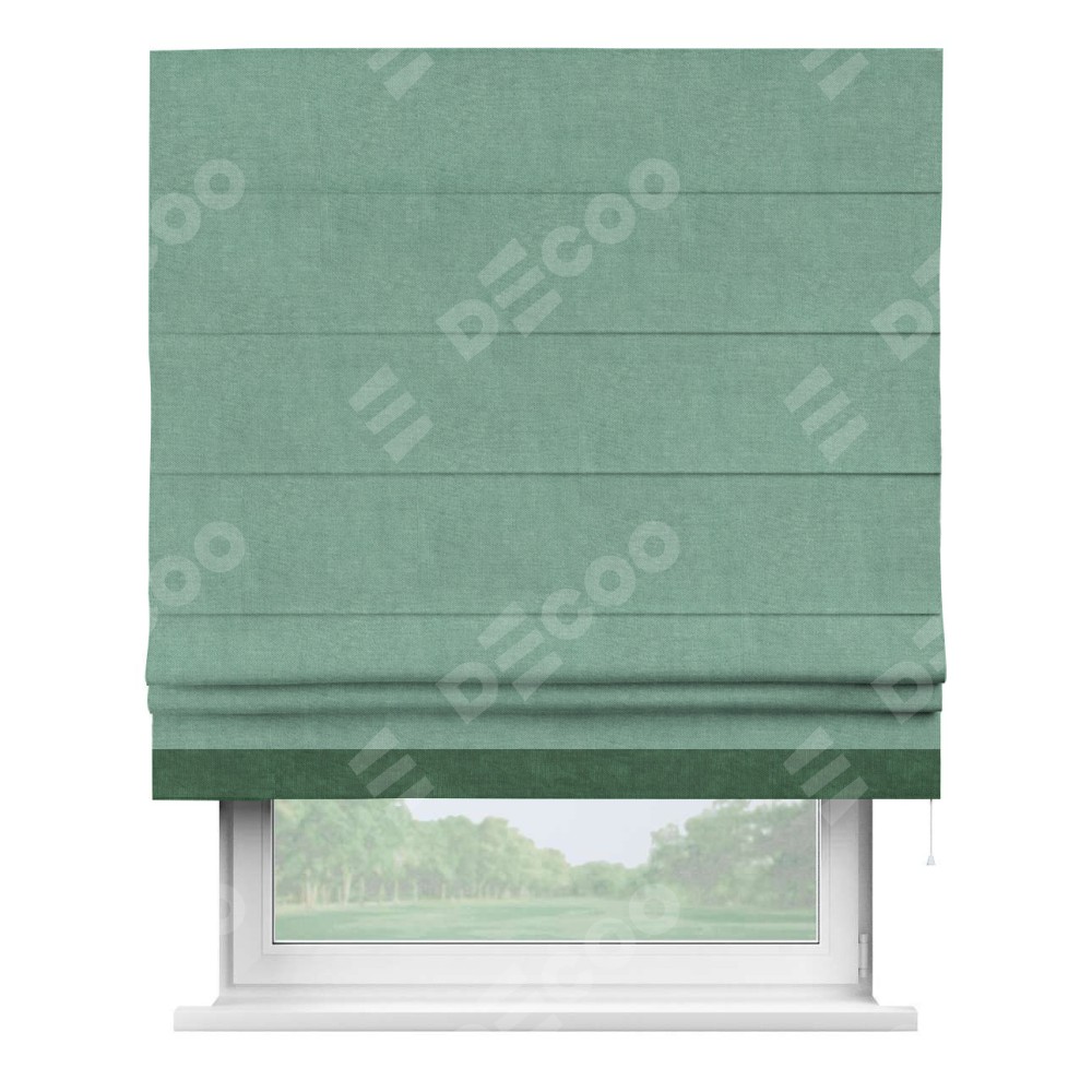 Римская штора производителя «Cortin», используется для проёма, пошита из ткани канвас мятный, артикул ткани v-248. Отделка шторы кантом «Джестер» (тёмно-зелёный v-469), ткань для канта используется из канваса разной расцветки на выбор. Имеет универсальный механизм и подходит для монтажа: на потолок, на стену и в нишу.
