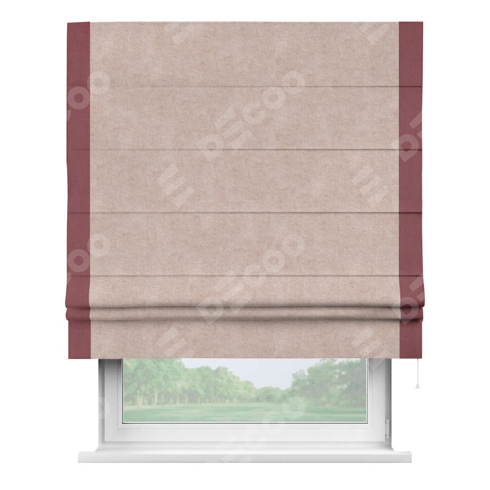 Римская штора производителя «Cortin», используется для проёма, пошита из ткани канвас пудровый, артикул ткани v-35. Отделка шторы кантом «Стрим Дуо» (ягодный v-28), ткань для канта используется из канваса разной расцветки на выбор. Имеет универсальный механизм и подходит для монтажа: на потолок, на стену и в нишу.