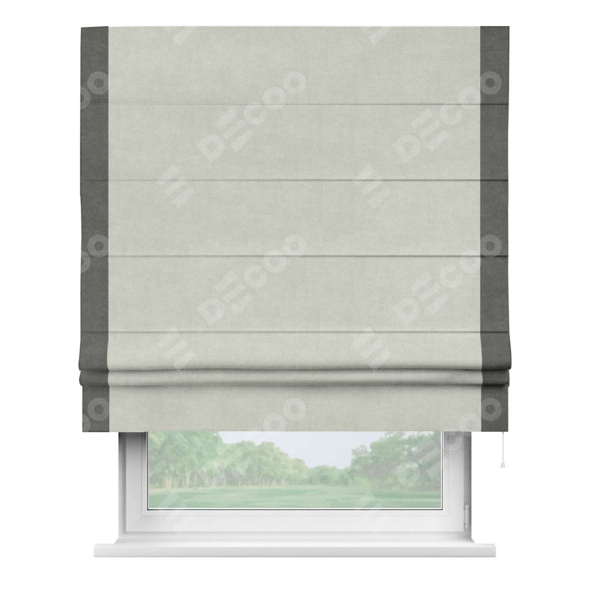 Римская штора производителя «Cortin», используется для проёма, пошита из ткани канвас светло-серый, артикул ткани v-371. Отделка шторы кантом «Стрим Дуо» (тёмно-серый v-340), ткань для канта используется из канваса разной расцветки на выбор. Имеет универсальный механизм и подходит для монтажа: на потолок, на стену и в нишу.