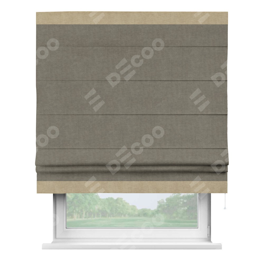 Римская штора производителя «Cortin», используется для проёма, пошита из ткани канвас серо-бежевый, артикул ткани v-224. Отделка шторы кантом «Горизонт» (кофе с молоком v-07), ткань для канта используется из канваса разной расцветки на выбор. Имеет универсальный механизм и подходит для монтажа: на потолок, на стену и в нишу.
