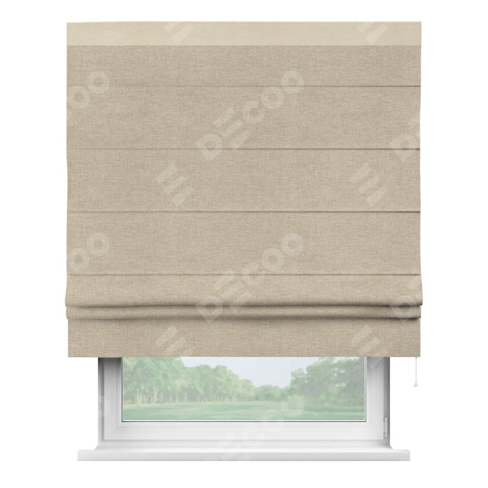Римская штора производителя «Cortin», используется для проёма, пошита из ткани лён кашемир бежевый, артикул 17206. Отделка шторы кантом «Кинг», ткань для канта используется из льна разной расцветки на выбор. Имеет универсальный механизм и подходит для монтажа: на потолок, на стену и в нишу.