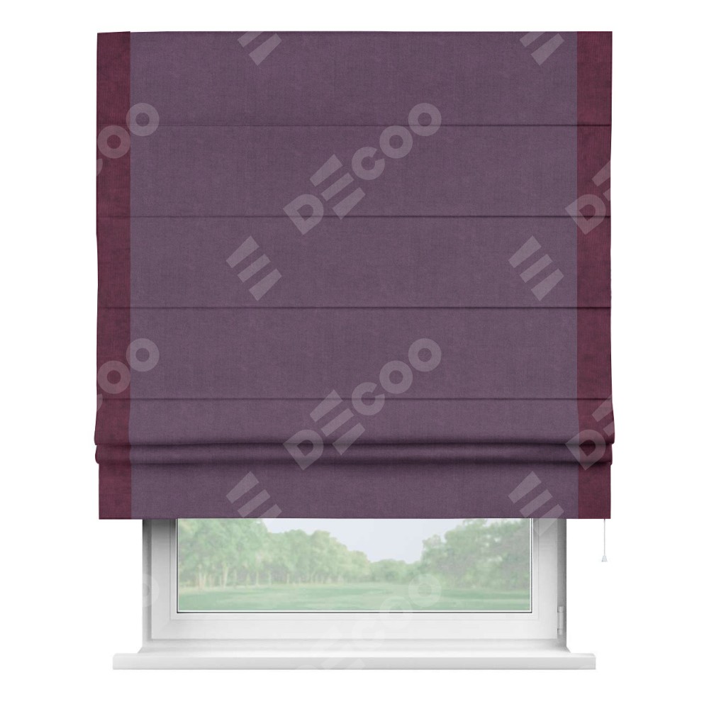 Римская штора производителя «Cortin», используется для проёма, пошита из ткани канвас сиреневый, артикул ткани v-98. Отделка шторы кантом «Стрим Дуо» (фиолетовый v-99), ткань для канта используется из канваса разной расцветки на выбор. Имеет универсальный механизм и подходит для монтажа: на потолок, на стену и в нишу.
