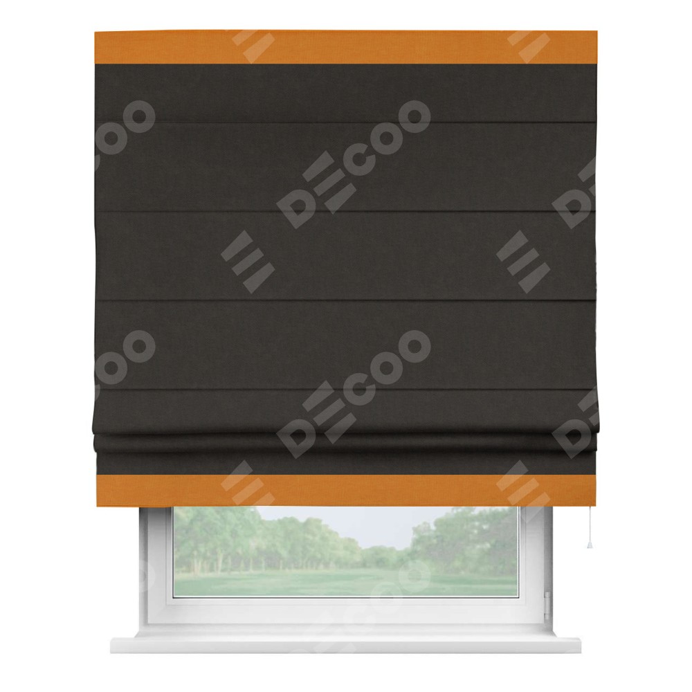 Римская штора производителя «Cortin», используется для проёма, пошита из ткани канвас тёмно-коричневый, артикул ткани v-13. Отделка шторы кантом «Горизонт» (оранжевый v-106), ткань для канта используется из канваса разной расцветки на выбор. Имеет универсальный механизм и подходит для монтажа: на потолок, на стену и в нишу.
