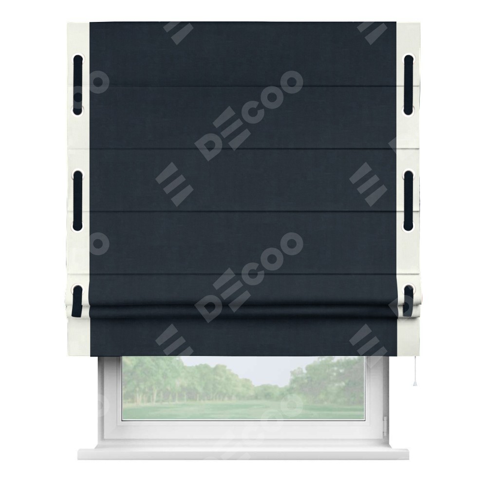Римская штора производителя «Cortin», используется для проёма, пошита из ткани канвас тёмно-синий, артикул ткани v-206. Отделка шторы кантом «Стрим Дуо» (молочный v-93) на кантах расположены люверсы с пояском, ткань для канта используется из канваса разной расцветки на выбор. Ткань для пояска обычно используется из основной ткани шторы, а так же можно сделать из любой расцветки по желанию. Имеет универсальный механизм и подходит для монтажа: на потолок, на стену и в нишу.