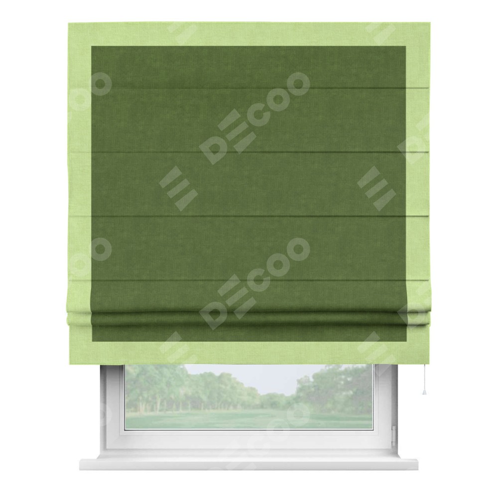 Римская штора производителя «Cortin», используется для проёма, пошита из ткани канвас трава, артикул ткани v-473. Отделка шторы кантом «Чесс» (липовый v-207), ткань для канта используется из канваса разной расцветки на выбор. Имеет универсальный механизм и подходит для монтажа: на потолок, на стену и в нишу.