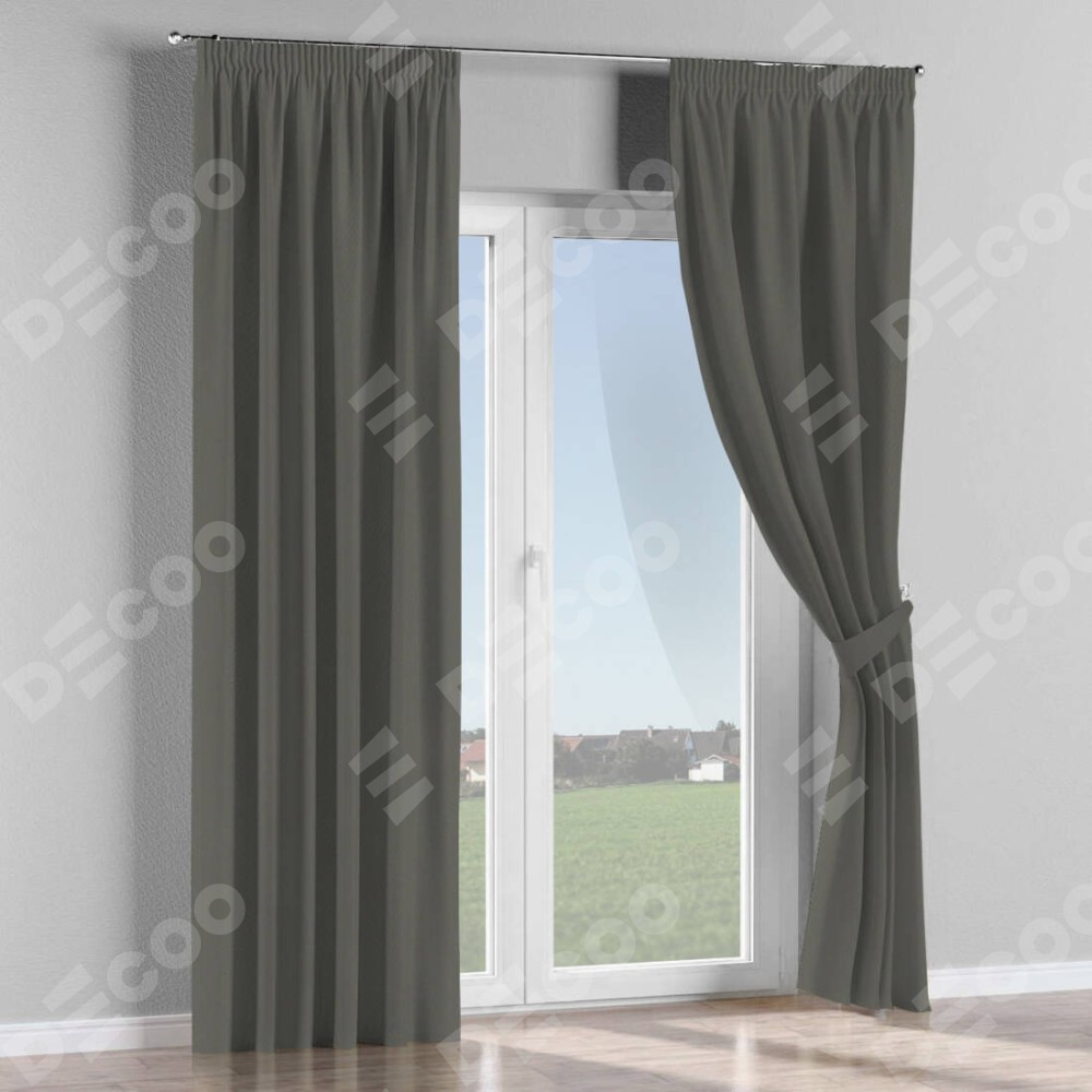 Комплект прямых штор, от производителя «Cortin», пошиты из ткани блэкаут однотонный тёмно-серый, артикул ткани 91570. С изнаночной стороны в верхней части штор пристрачивается шторная лента с декоративными складками «Карандаш». Для создания элегантных складок прямые шторы шьются по стандарту с коэффициентом 1:2 (на 100 см. ширины проёма 200 см. ширины ткани).