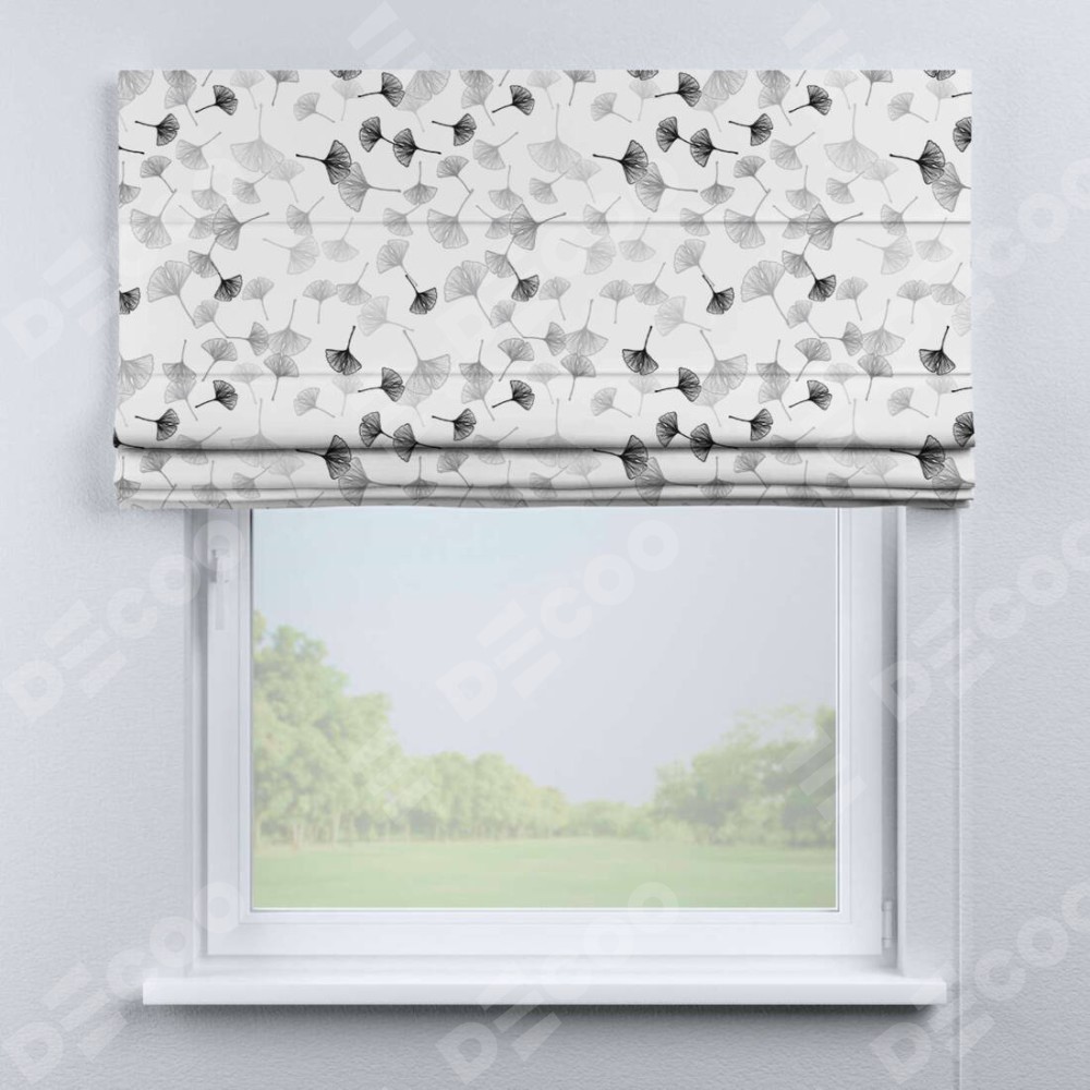 Классическая римская штора производителя «Cortin», пошита из ткани блэкаут с нанесением сублимационной печати «Дымчатые листочки». Имеет универсальный механизм и подходит для монтажа: на потолок, на стену и в нишу.