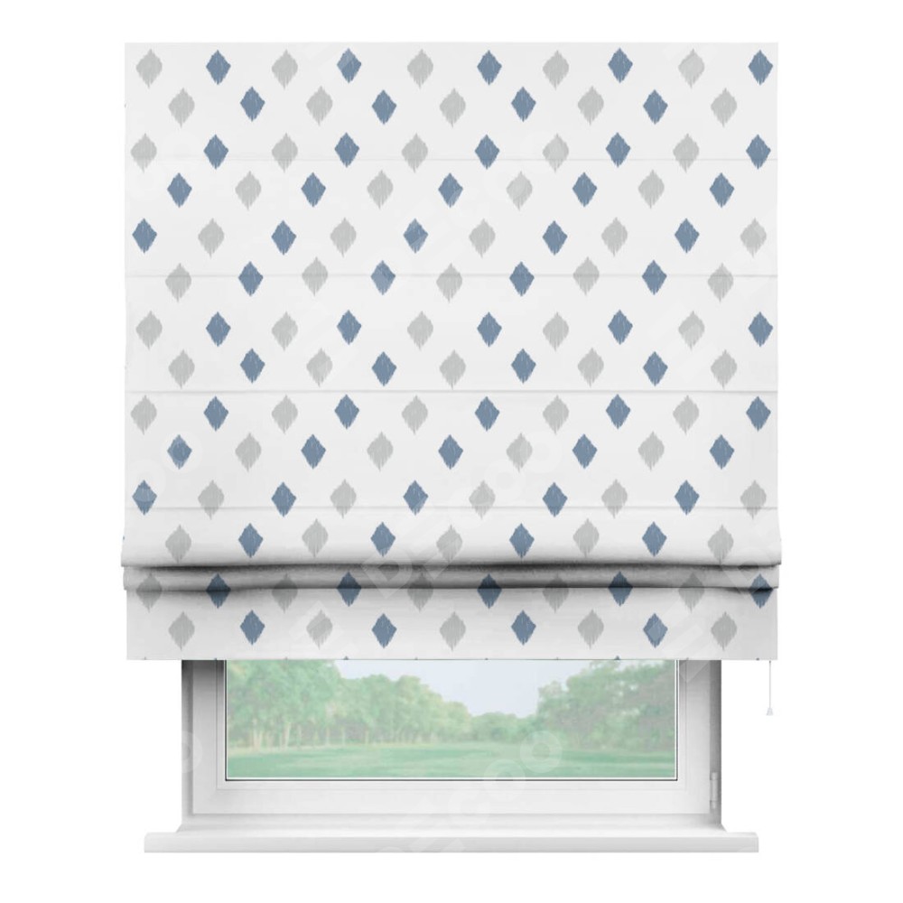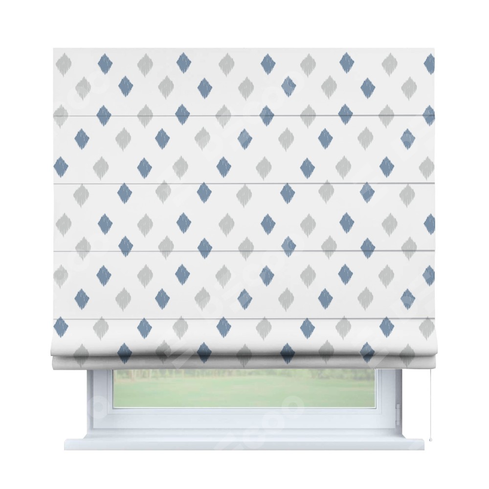 Классическая римская штора производителя «Cortin», пошита из ткани блэкаут с нанесением сублимационной печати «Икат ромбики». Имеет универсальный механизм и подходит для монтажа: на потолок, на стену и в нишу.