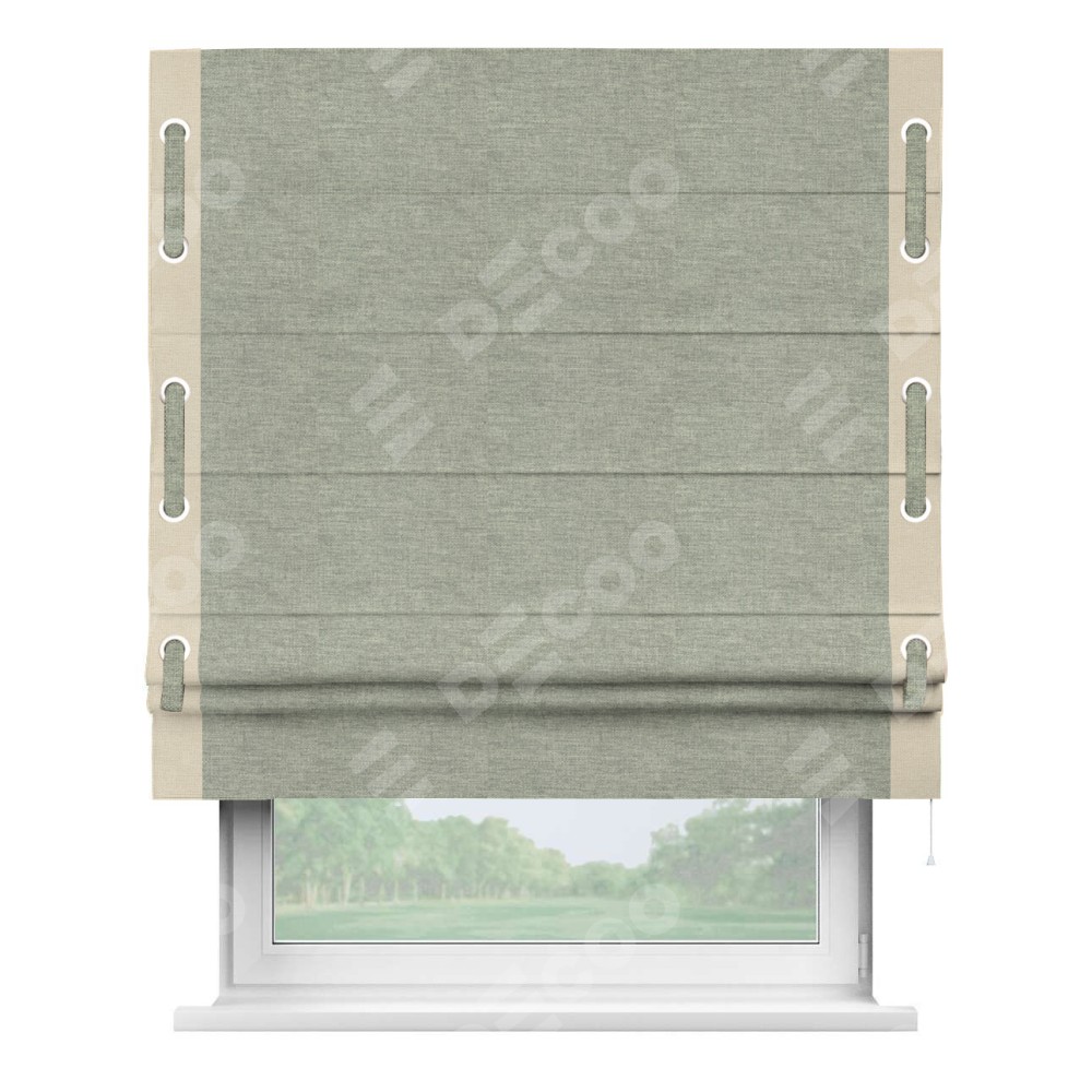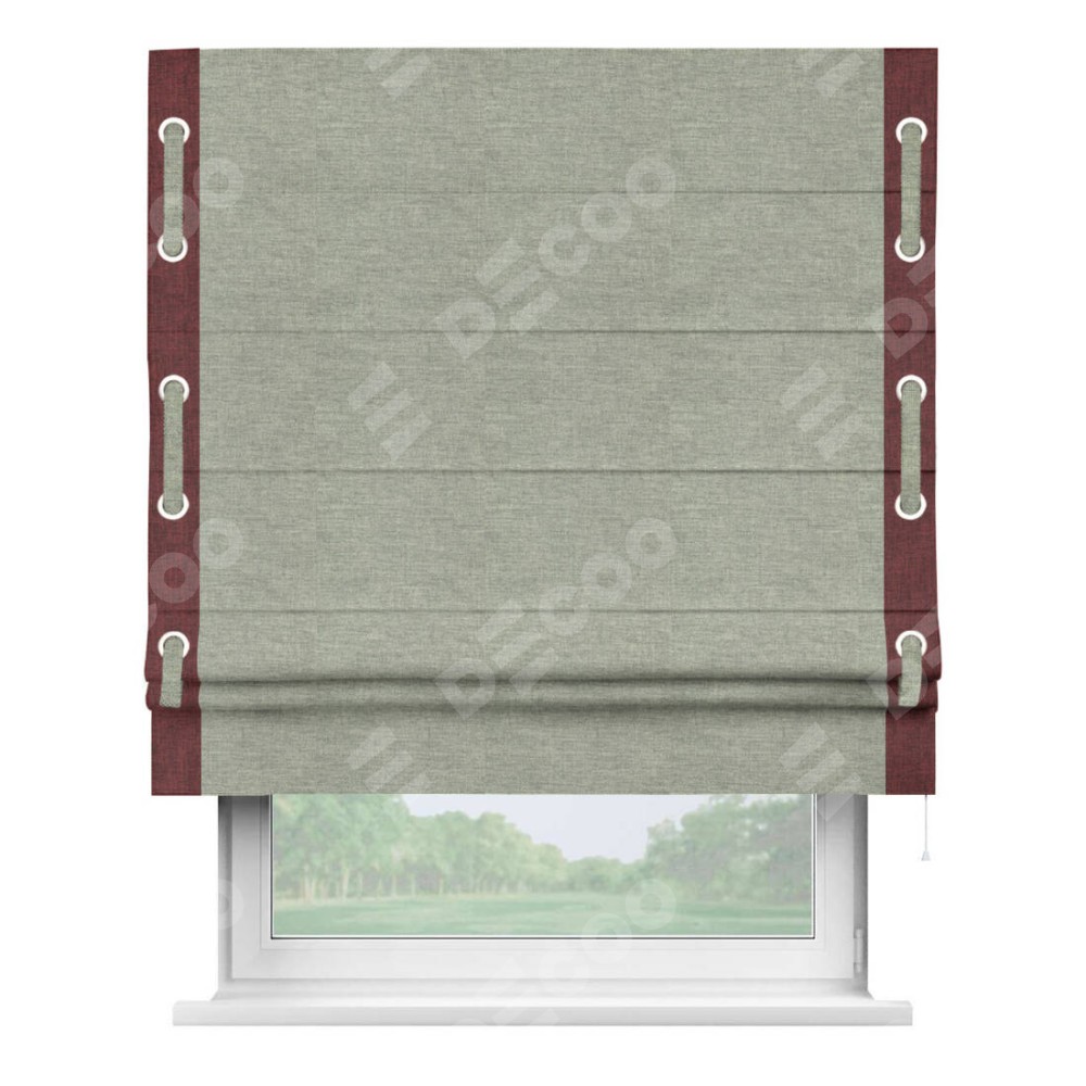Римская штора производителя «Cortin», используется для проёма, пошита из ткани лён кашемир серый new, артикул 21618. Отделка шторы кантом «Стрим Дуо» на кантах расположены люверсы с пояском, ткань для канта используется из льна разной расцветки на выбор. Ткань для пояска обычно используется из основной ткани шторы, а так же можно сделать из любой расцветки по желанию. Имеет универсальный механизм и подходит для монтажа: на потолок, на стену и в нишу.