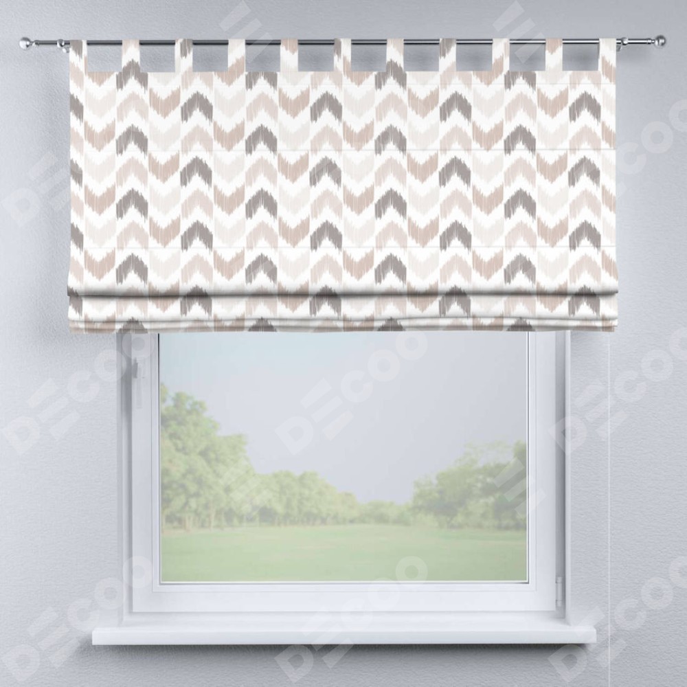 Римская штора производителя «Cortin», используется для проёма, пошита из ткани блэкаут с нанесением сублимационной печати «Икат стрелки». Данная модель пошита на петлях, комплектуется на выбор круглым карнизом и подходит для монтажа на стену. Римская штора на петлях имеет простую систему регулировки высоты, отличительным преимуществом данной модели является простой способ монтажа. Достаточно повесить ее на трубу и штора готова!