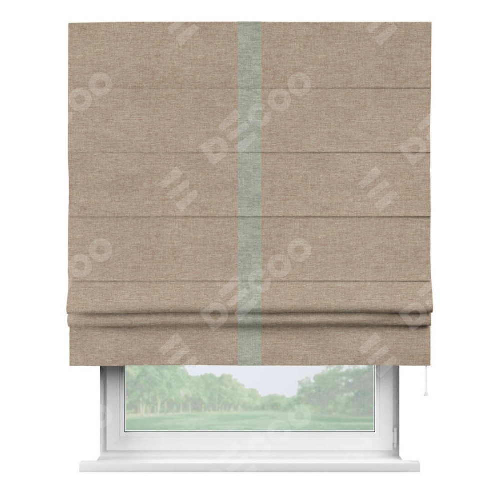 Римская штора производителя «Cortin», используется для проёма, пошита из ткани лён кашемир коричневый, артикул 21614. Отделка шторы кантом «Хайвэй», ткань для канта используется из льна разной расцветки на выбор. Имеет универсальный механизм и подходит для монтажа: на потолок, на стену и в нишу.