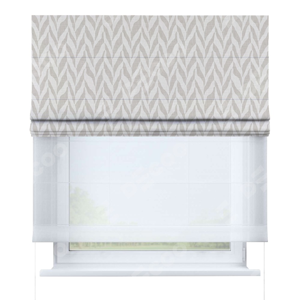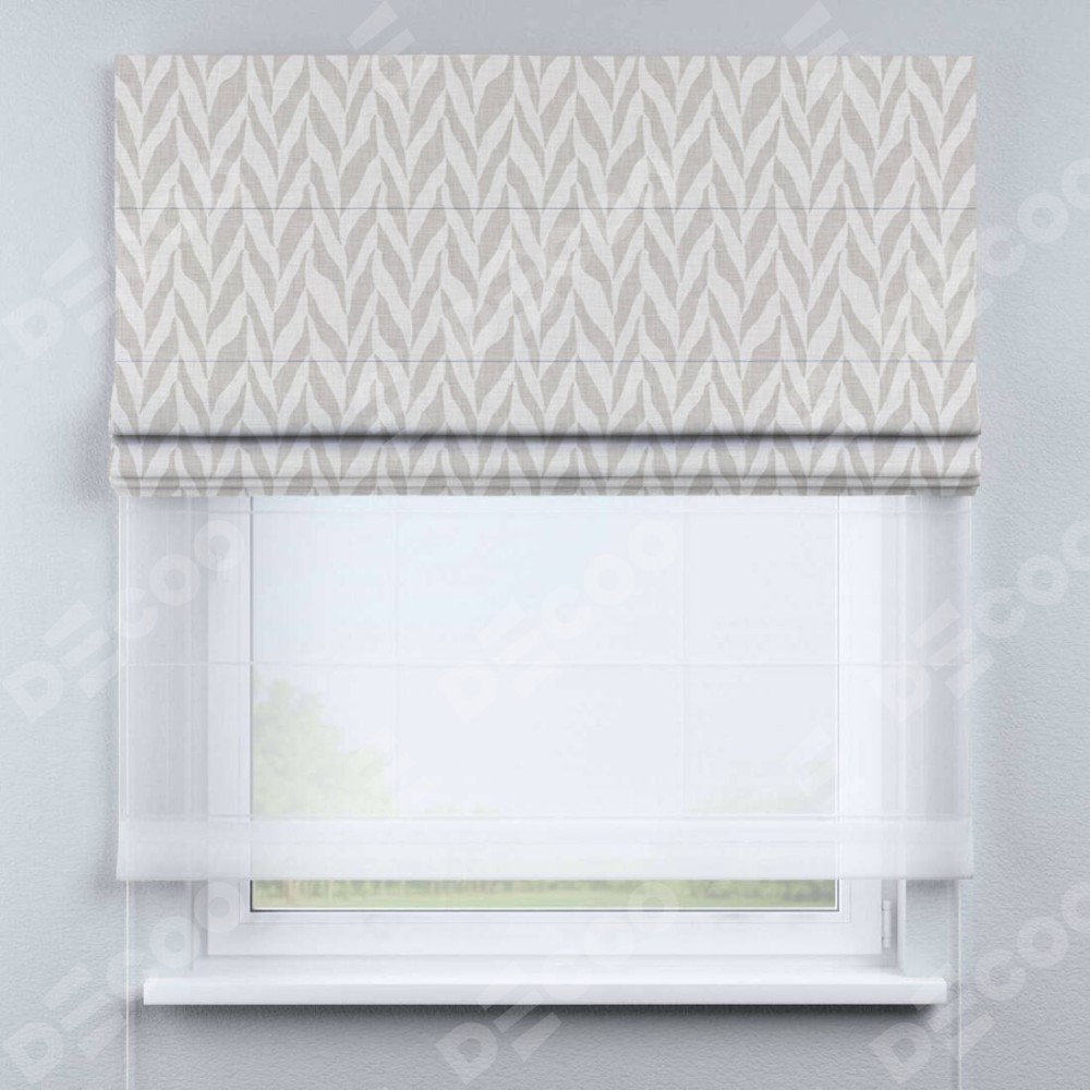 Двойная римская штора «День-ночь» от производителя Cortin предназначена для использования в проёмах. Эта штора уникальна тем, что состоит из двух полотен. На лицевой стороне находится блэкаут с нанесением сублимационной печати «Песочный зебрано», обеспечивающий эффективное затемнение. В комплект также входит вторая ткань — легкий белый тюль (артикул: V-01), который добавляет изящества и легкости оформлению окна. Кроме того, доступны и другие разновидности ткани тюль, выбор которых доступен по  ссылке .