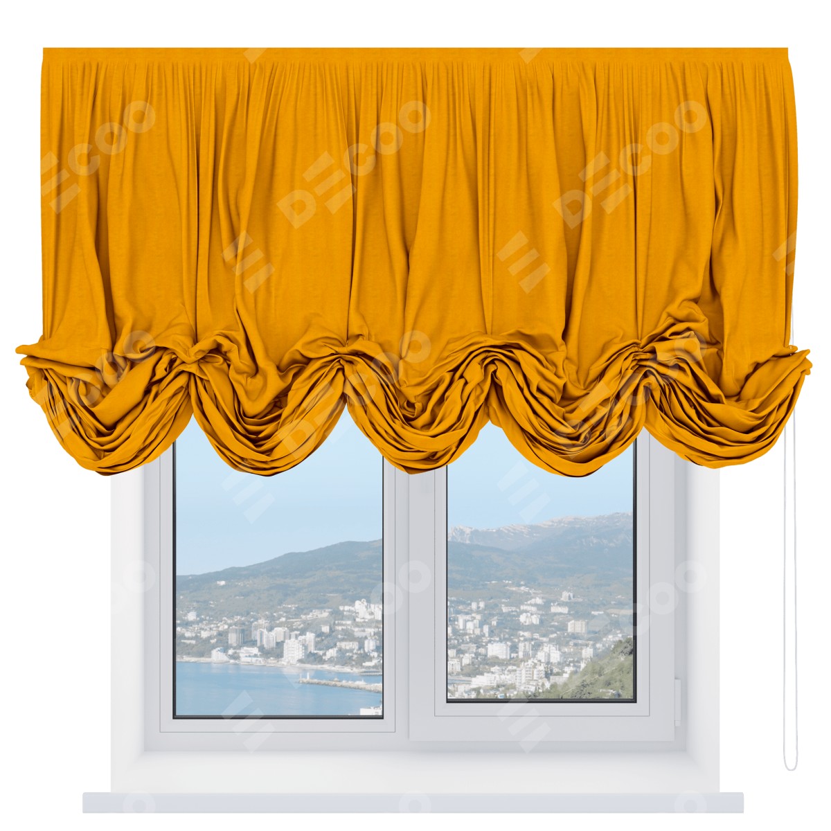 Австрийская штора производителя «Cortin», используется для проёма, пошита из ткани вельвет желтый, артикул ткани 85547. Имеет универсальный механизм и подходит для монтажа: на потолок и на стену.