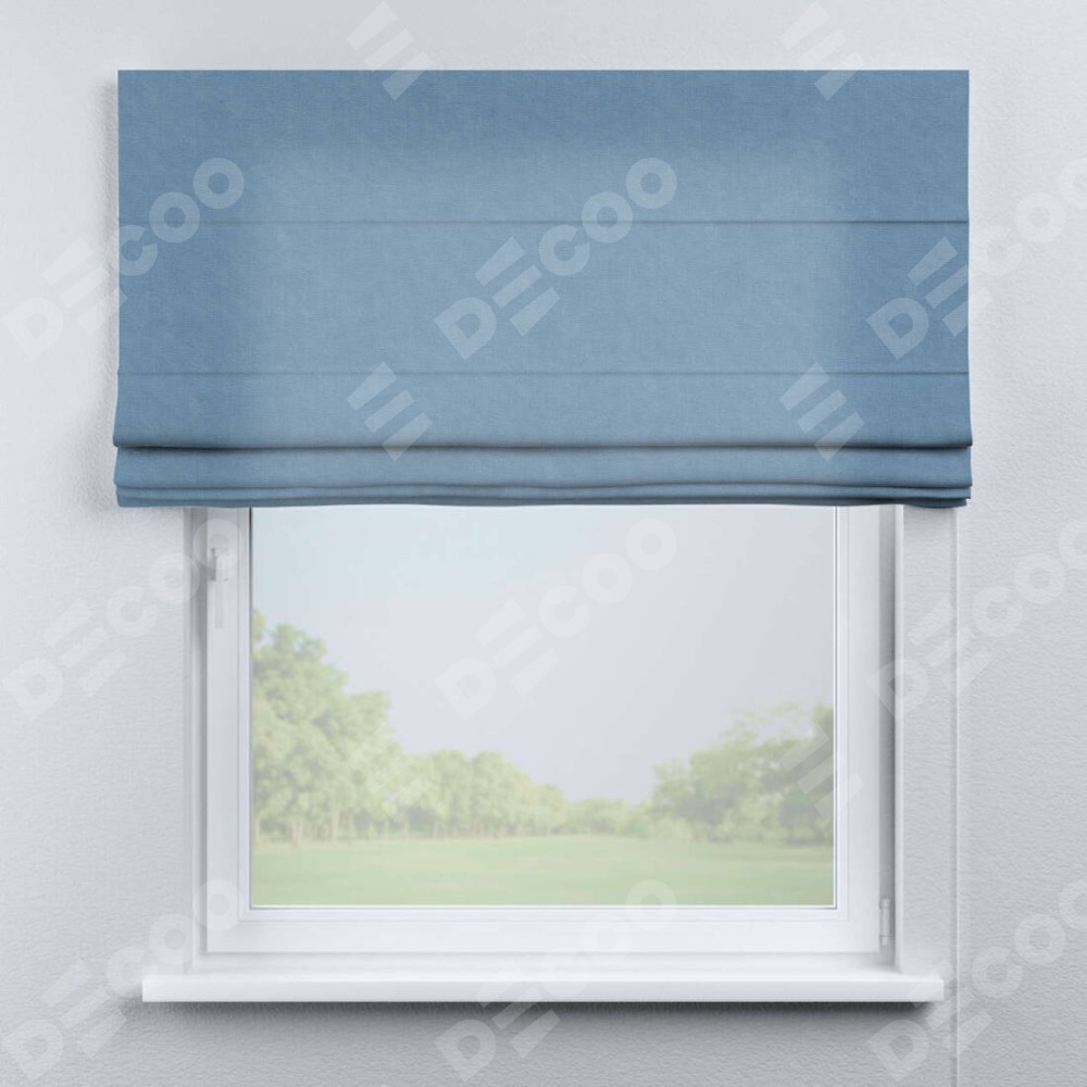 Классическая римская штора производителя «Cortin», пошита из ткани канвас голубой, артикул: 92729. Имеет универсальный механизм и подходит для монтажа: на потолок, на стену и в нишу.