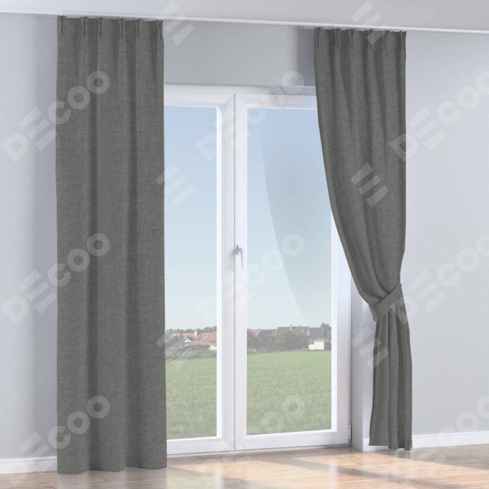 Комплект прямых штор, от производителя «Cortin», пошиты из ткани лён тёмно-серый, артикул ткани 7441. С изнаночной стороны в верхней части штор пристрачивается шторная лента с декоративными складками «Кустик». Для создания элегантных складок прямые шторы шьются по стандарту с коэффициентом 1:2 (на 100 см. ширины проёма 200 см. ширины ткани).