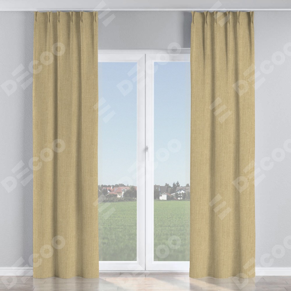Комплект прямых штор, от производителя «Cortin», пошиты из ткани лён димаут песочный, артикул ткани 16256. С изнаночной стороны в верхней части штор пристрачивается шторная лента с декоративными складками «Кустик». Для создания элегантных складок прямые шторы шьются по стандарту с коэффициентом 1:2 (на 100 см. ширины проёма 200 см. ширины ткани).