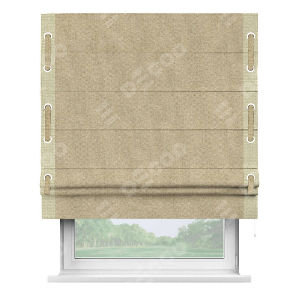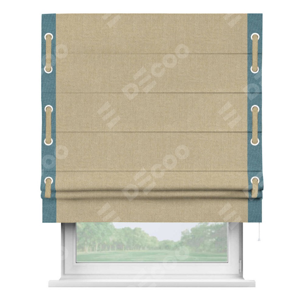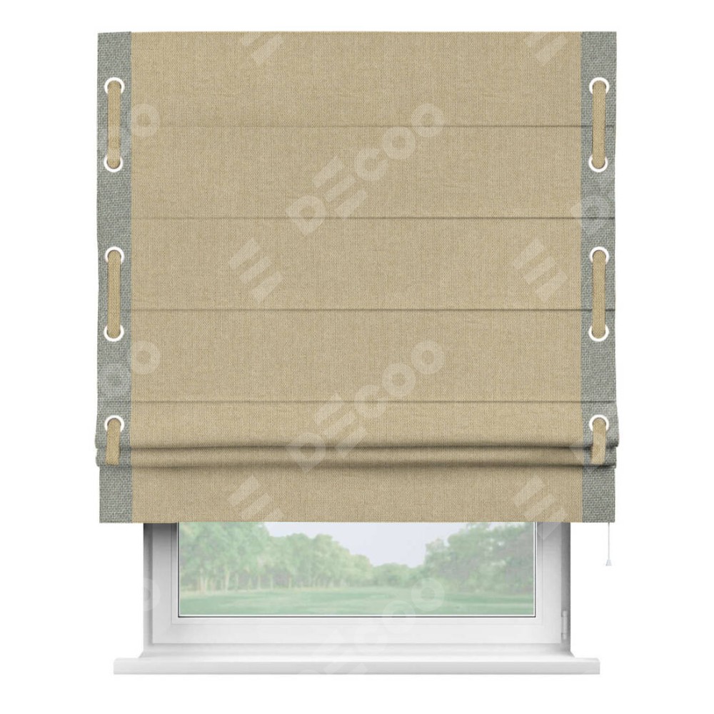 Римская штора пошита из ткани лён димаут песочный, артикул: 16256, с отделкой кантом «Стрим Дуо», дополненная декоративными люверсами на этих кантах и протянутым пояском из основного цвета римской шторы, представляет собой высоко декоративное и функциональное решение для оконного оформления. Канты, расположенные по обеим боковым сторонам шторы, уже добавляют изысканности и завершенности внешнему виду. Добавление люверсов и пояска не только усиливает декоративный эффект, но и придает шторе дополнительную текстурность и глубину.