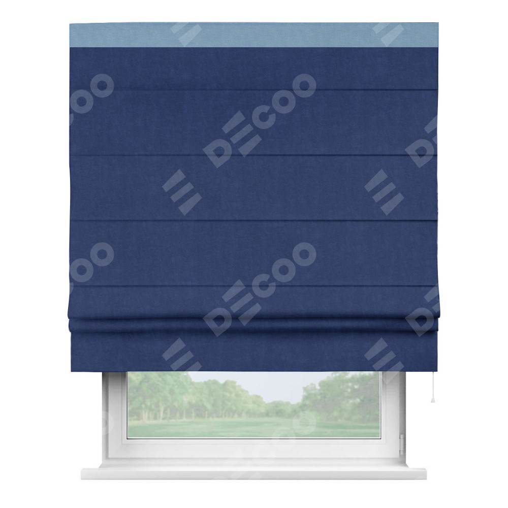 Если у вас уже установлена наша штора, то вам не обязательно снова покупать весь продукт — вы можете легко купить и заменить только ткань. Новая ткань доступна для заказа на нашем сайте, и её замена не требует особых усилий, позволяя вам экономить и обновлять ваш интерьер без лишних расходов. Римская штора производителя «Cortin», используется для проёма, пошита из ткани канвас синий, артикул ткани v-573. Отделка шторы кантом «Кинг», ткань для канта используется из вельвета разной расцветки на выбор. Имеет универсальный механизм и подходит для монтажа: на потолок, на стену и в нишу.