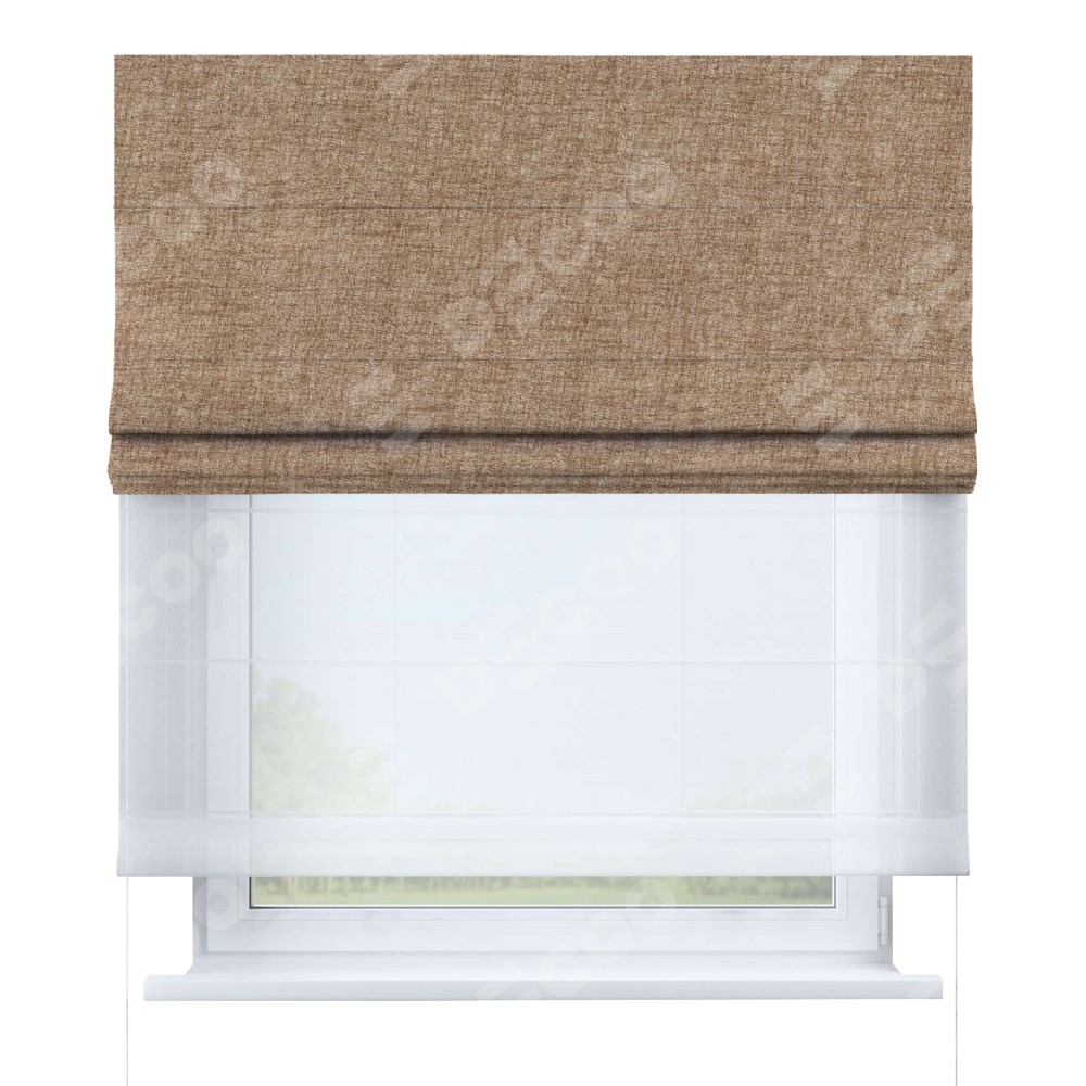 Двойная римская штора «День-ночь» от производителя Cortin предназначена для использования в проёмах. Эта штора уникальна тем, что состоит из двух полотен. На лицевой стороне находится рогожка димаут светло-коричневый (артикул: 91017), обеспечивающая комфортное затемнение. В комплект также входит вторая ткань — легкий белый тюль (артикул: V-01), который добавляет изящества и легкости оформлению окна. Кроме того, доступны и другие разновидности ткани тюль, выбор которых доступен по  ссылке .