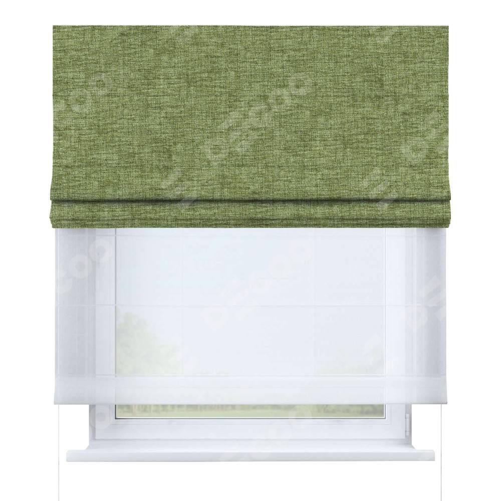 Двойная римская штора «День-ночь» от производителя Cortin предназначена для использования в проёмах. Эта штора уникальна тем, что состоит из двух полотен. На лицевой стороне находится рогожка димаут травяной (артикул: 91021), обеспечивающая комфортное затемнение. В комплект также входит вторая ткань — легкий белый тюль (артикул: V-01), который добавляет изящества и легкости оформлению окна. Кроме того, доступны и другие разновидности ткани тюль, выбор которых доступен по ссылке .